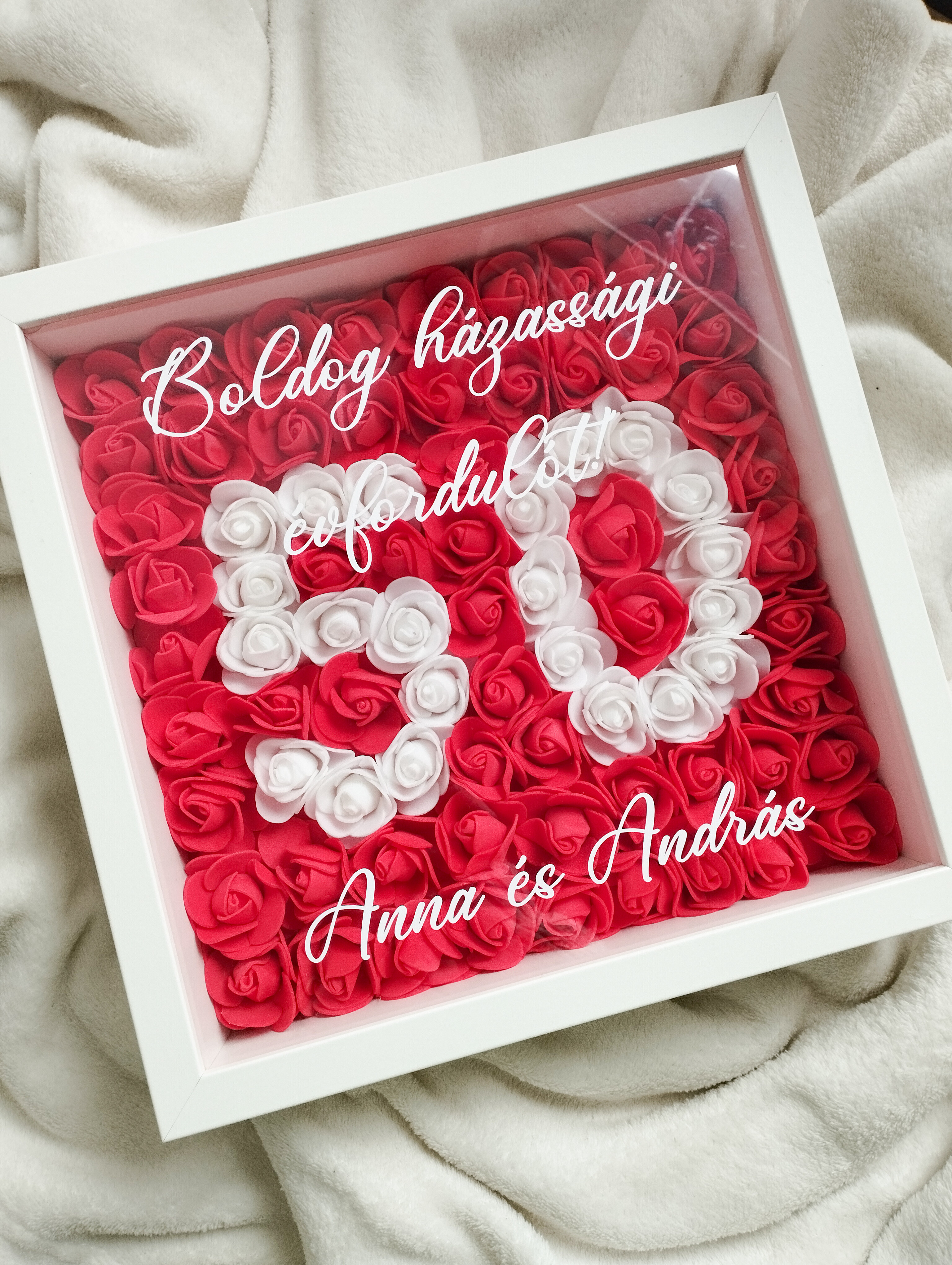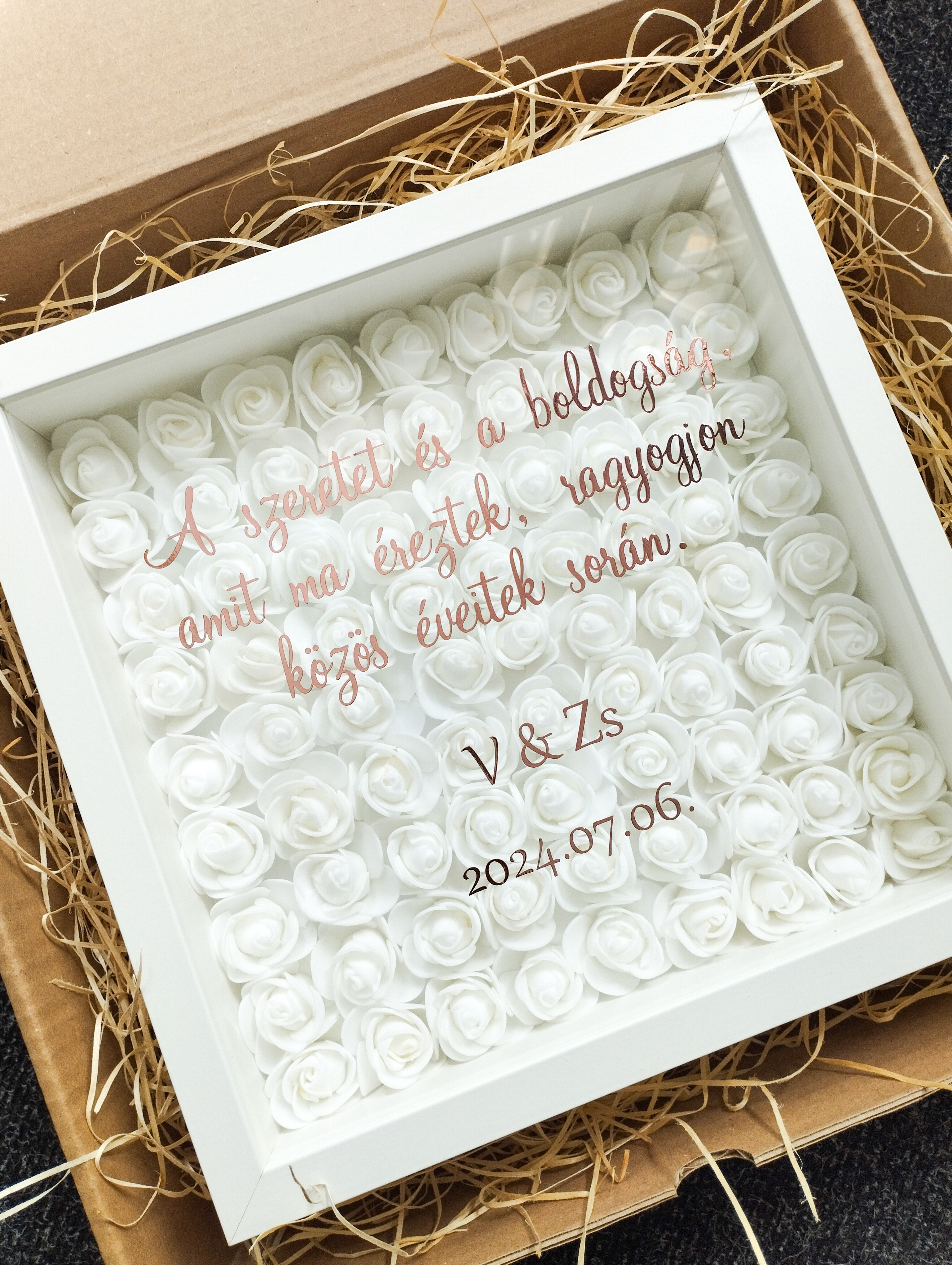 Kézzel készül, aprólékosan összeállított rózsákból, igényes keretben, választható felirattal és színben. A doboz nemcsak ajándék, hanem örök emlék és dekoráció is, amely bármely enteriőrt megszépít.