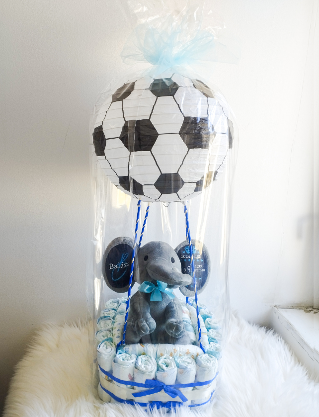 Egyedi, kézzel készített pelenkatorta, amely egyszerre praktikus ajándék és látványos meglepetés is. A hőlégballon formájú díszítés, a puha plüss elefánt a baba születési adataival és a gondosan feltekert pelenkák tökéletes harmóniát alkotnak, igazi „wow” ajándék minden babalátogatásra!