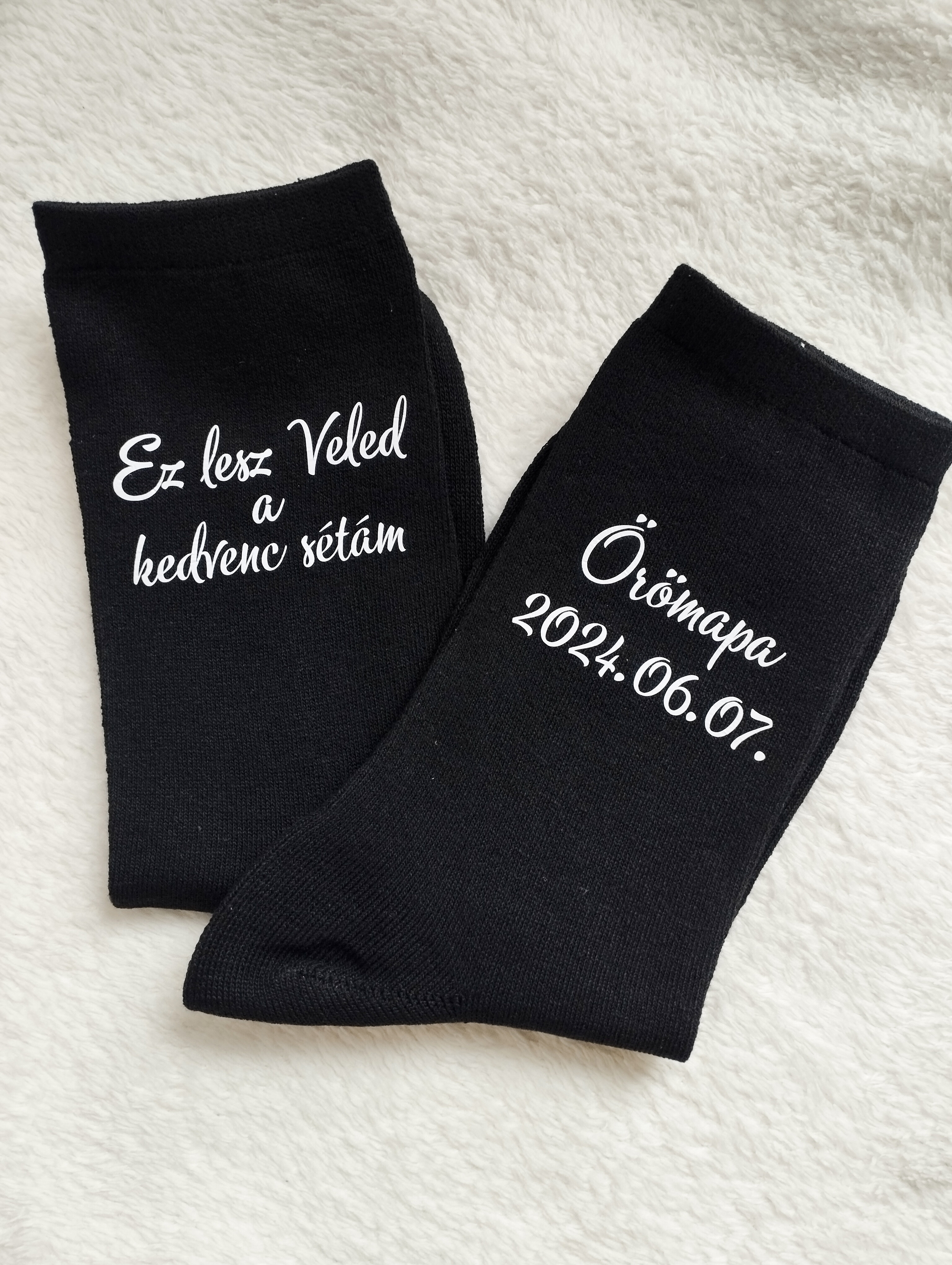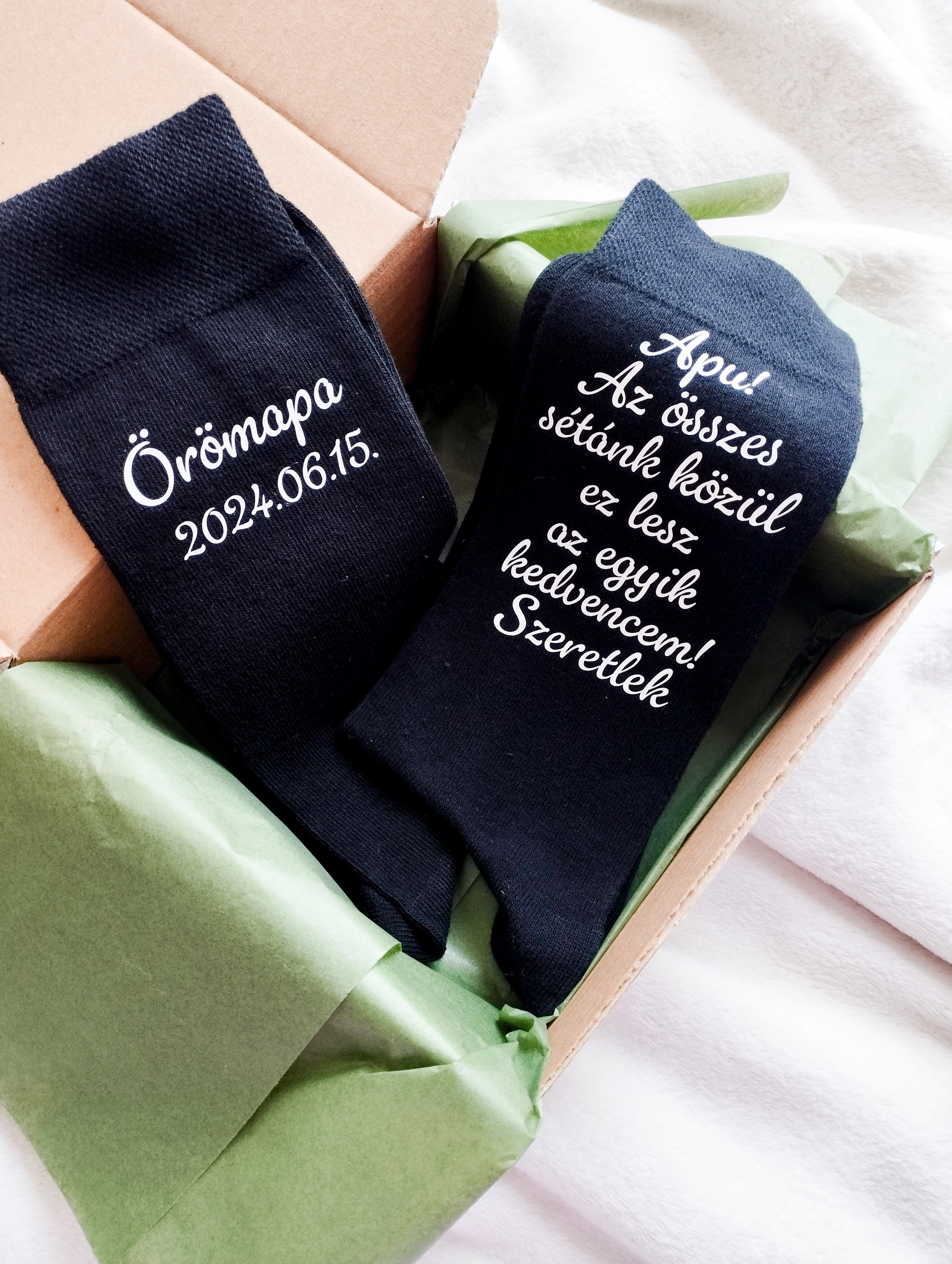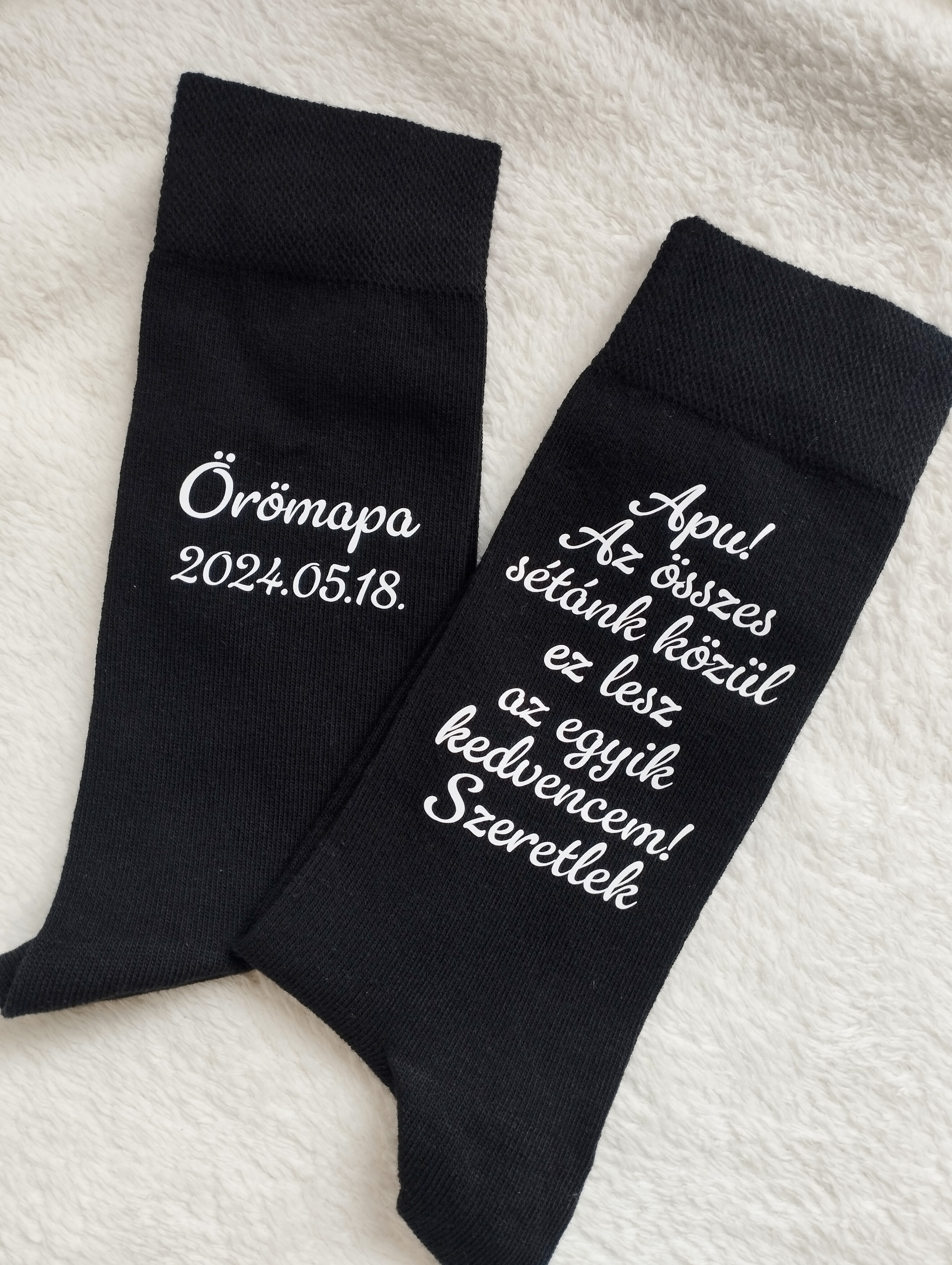 Ez a személyre szabott, feliratos esküvői zokni tökéletes ajándék az örömapának. Apró gesztus, ami mosolyt csal az arcára, miközben a nagy nap minden pillanatát áthatja a szeretet és a gondoskodás.