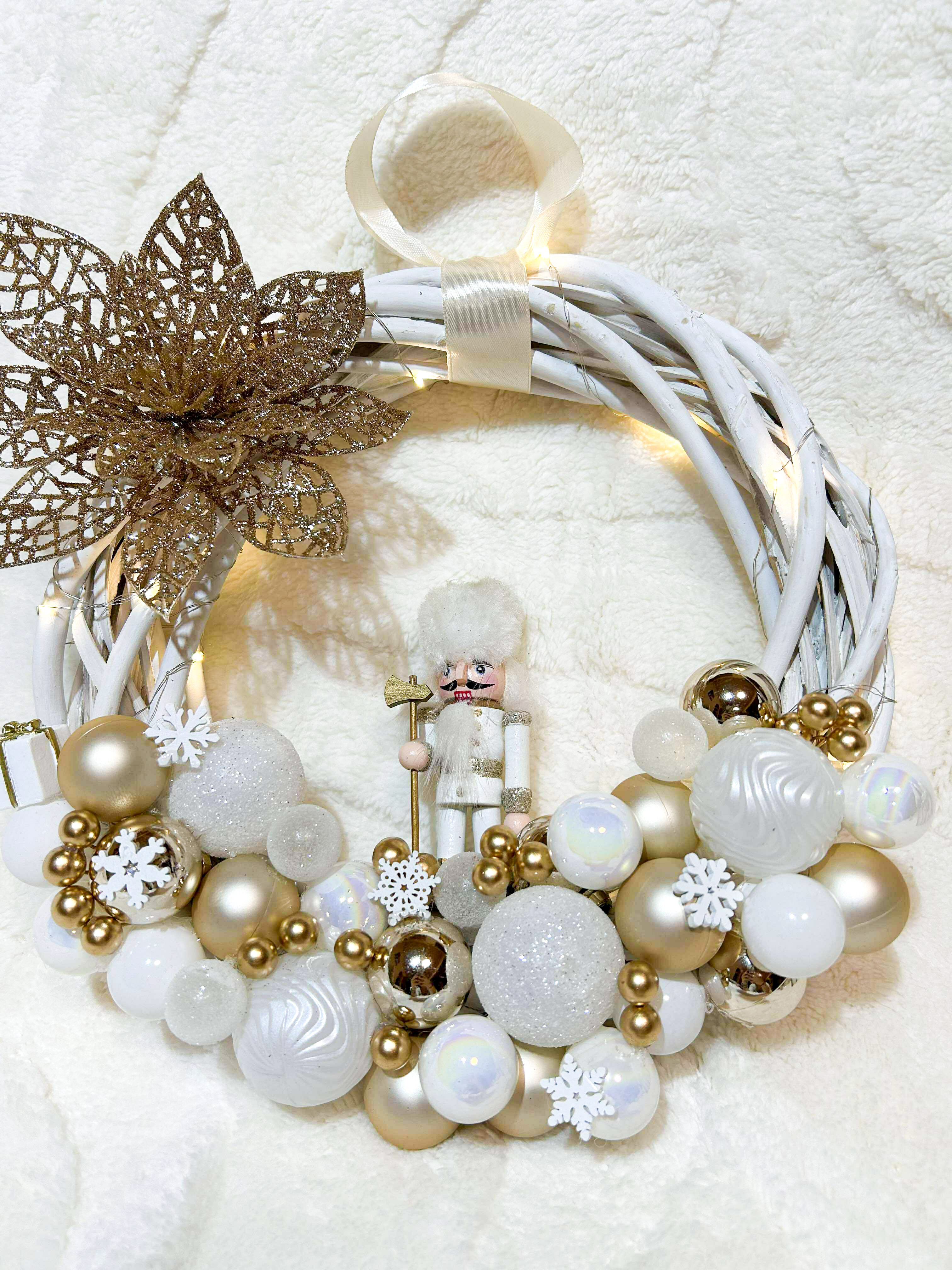 Ha igazán különleges, mesebeli hangulatot szeretnél vinni otthonodba, ez a diótörős karácsonyi kopogtató tökéletes választás. A kézzel készült dekoráció fehérre festett fonott koszorúalapon készül, amelyet arany-fehér gömbök, csillogó részletek és egy ragyogó nagy virág tesz igazán ünnepivé.
