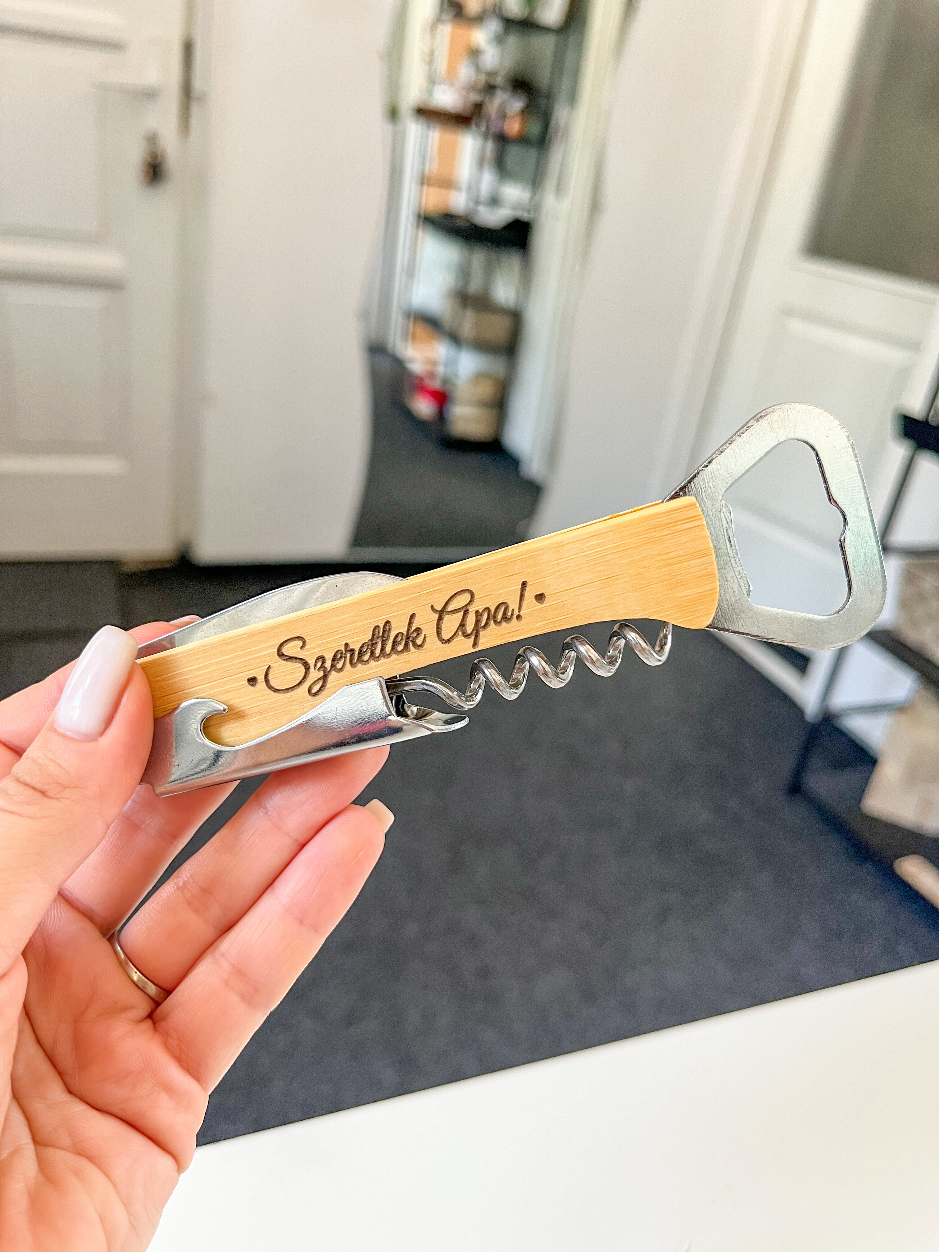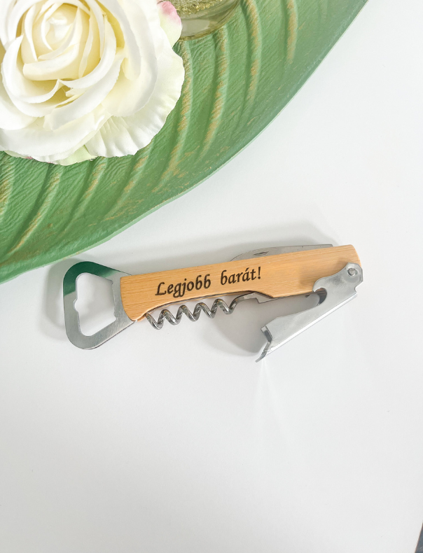 A gravírozott fa bornyitó tökéletes ajándék bárkinek. Praktikus, elegáns és egyedi, egy olyan apróság, ami garantáltan mindig kéznél lesz.
