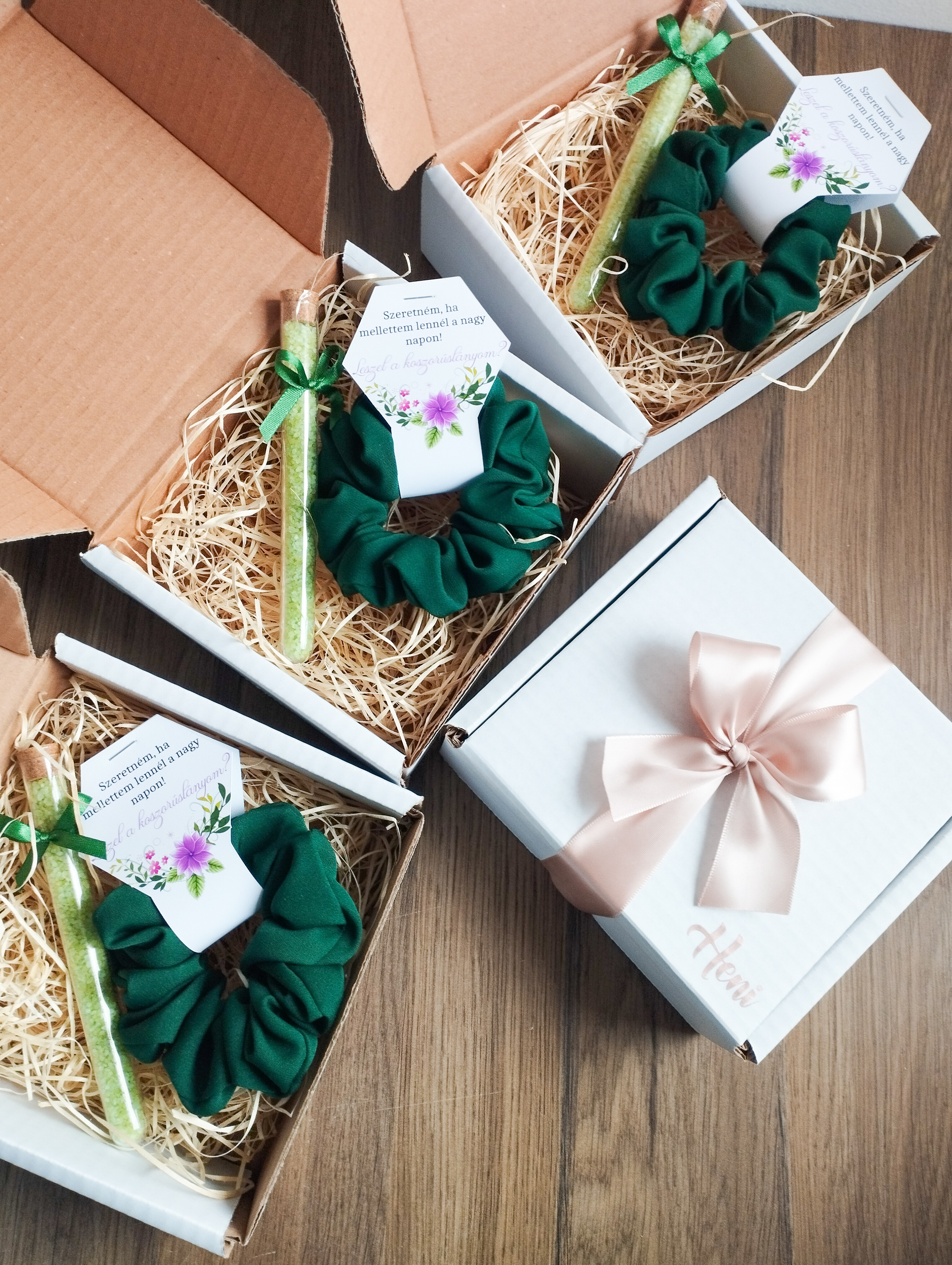 Egy különleges módja annak, hogy megkérd a legjobb barátnőidet, legyenek ott veled a nagy napon. Ez a stílusos ajándékbox apró, mégis szívhez szóló meglepetéseket rejt, amelyekkel garantáltan mosolyt csalhatsz a koszorúslányok arcára. Minden részlet gondosan megkomponált, a harmonikus színek, a csomagolás és a személyes üzenet tökéletes egységet alkot.
