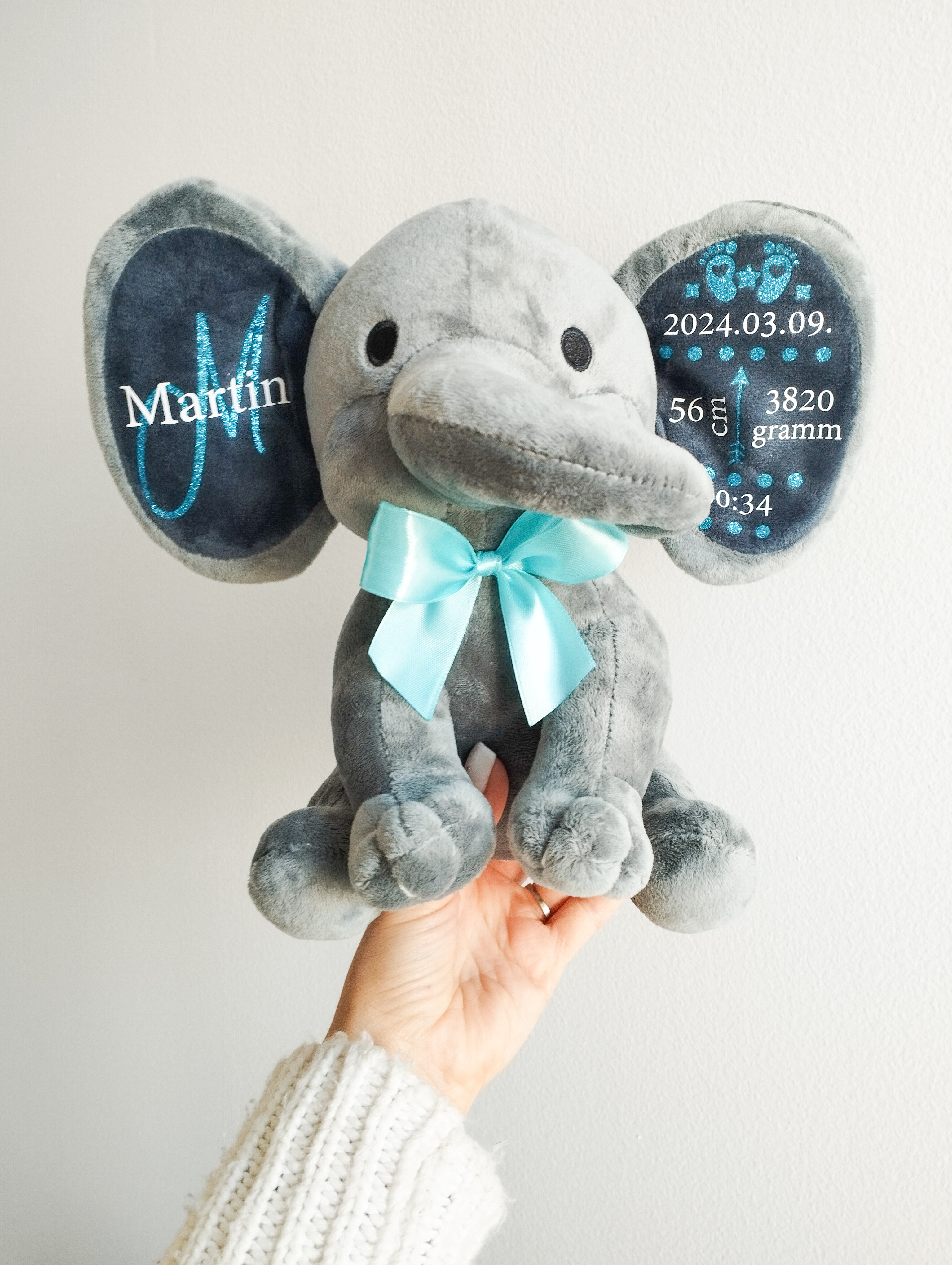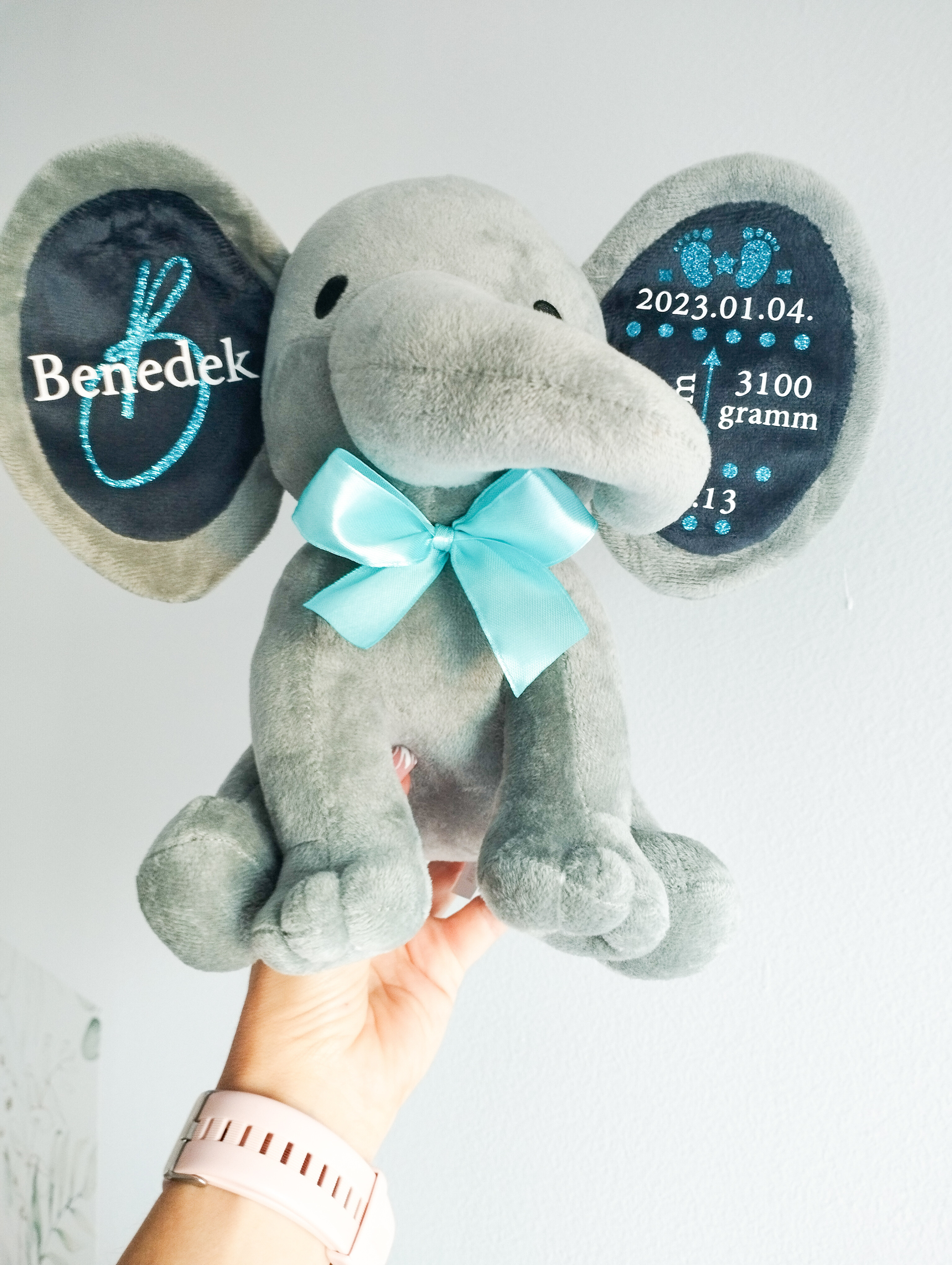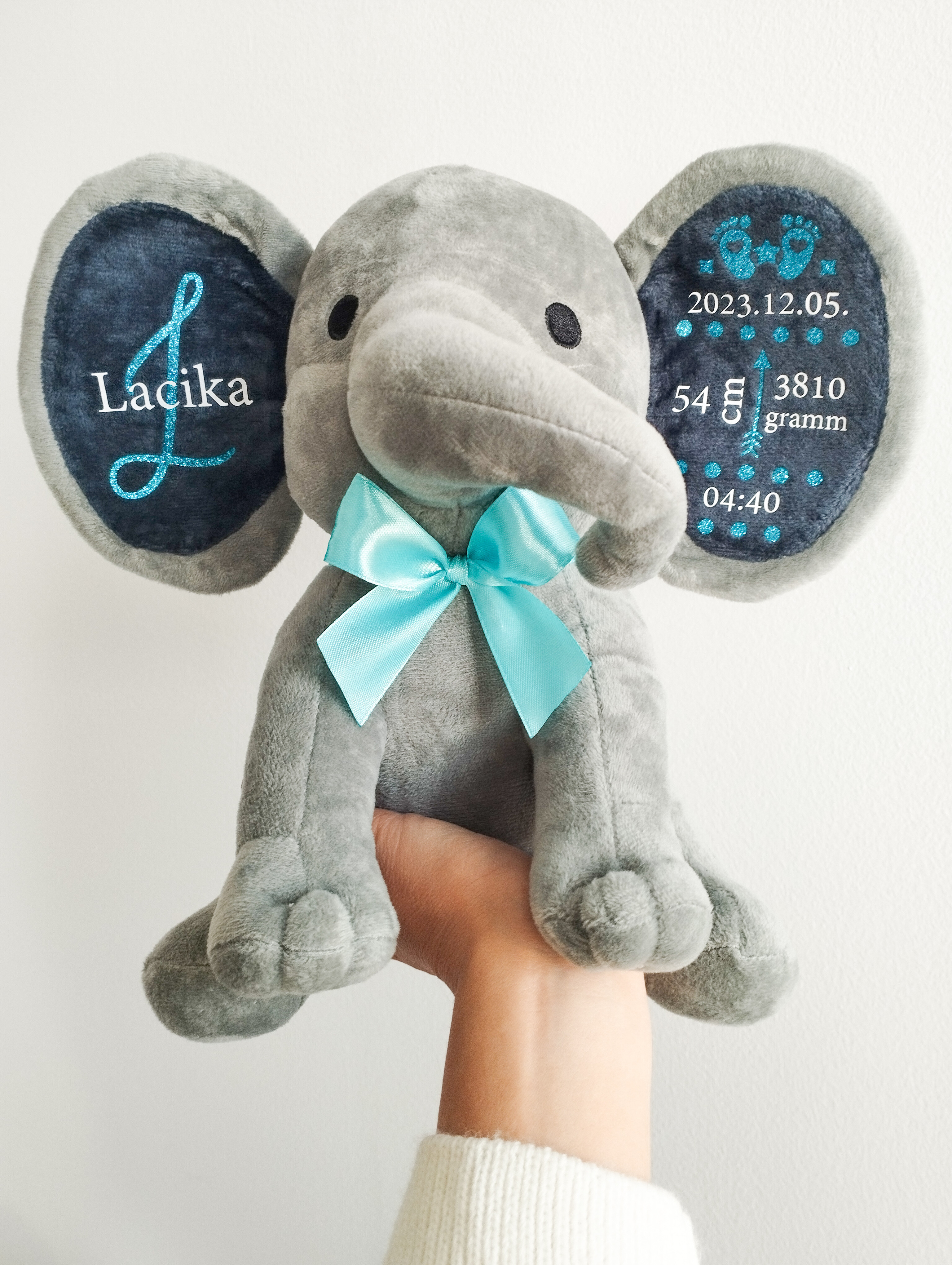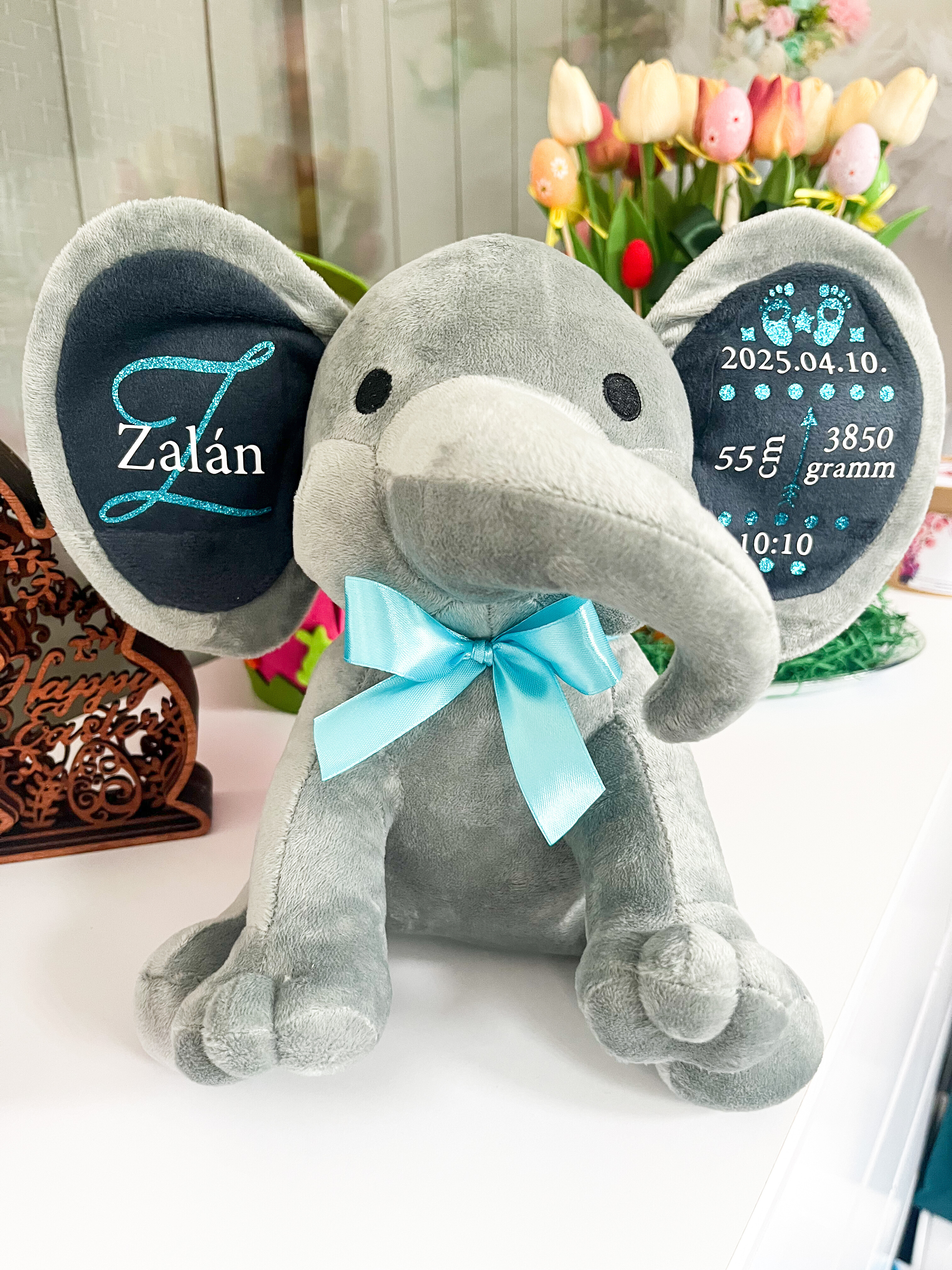 A puha, minőségi plüss elefánt személyre szabható feliratokkal készül, így igazán egyedi és megható ajándék babalátogatóba, keresztelőre vagy születésnapra.