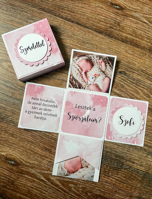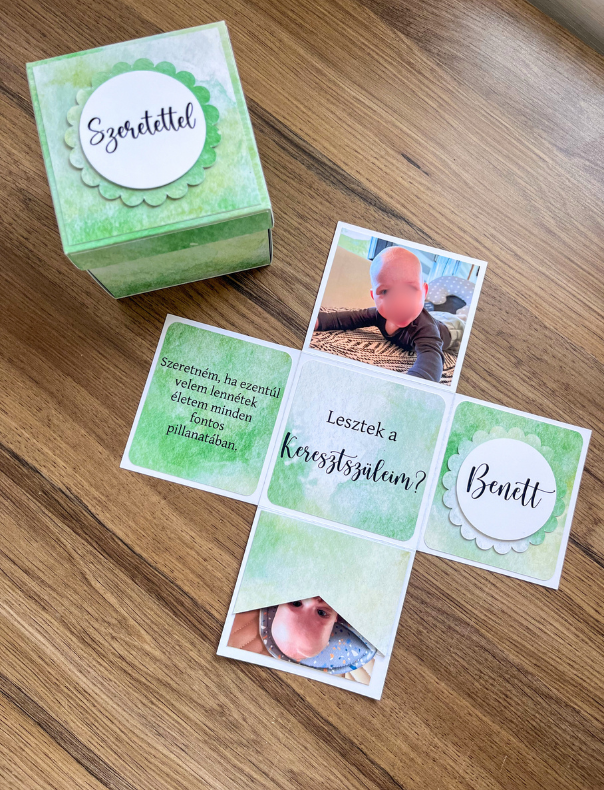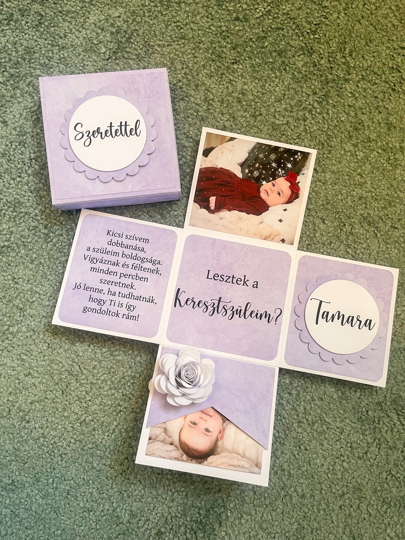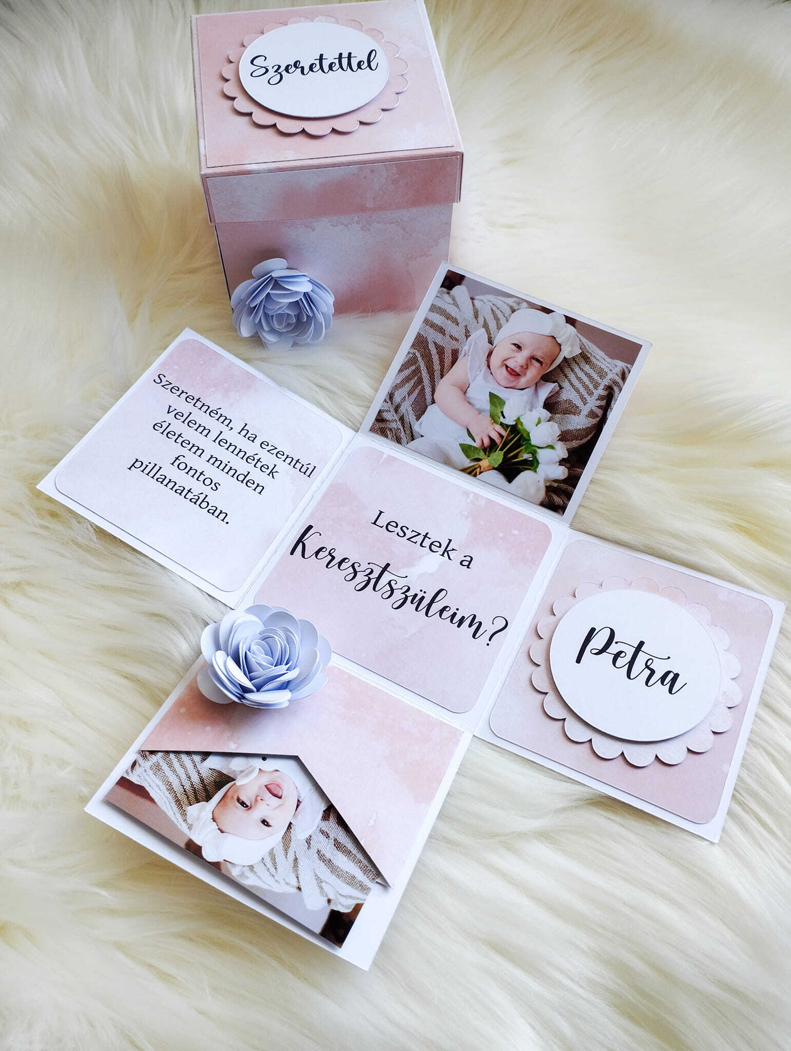 Egy különleges pillanat megörökítése még különlegesebb formában. Ez a kézzel készült, egyedi „exploding box” stílusú doboz a legszebb módja annak, hogy felkérd a keresztszülőket.