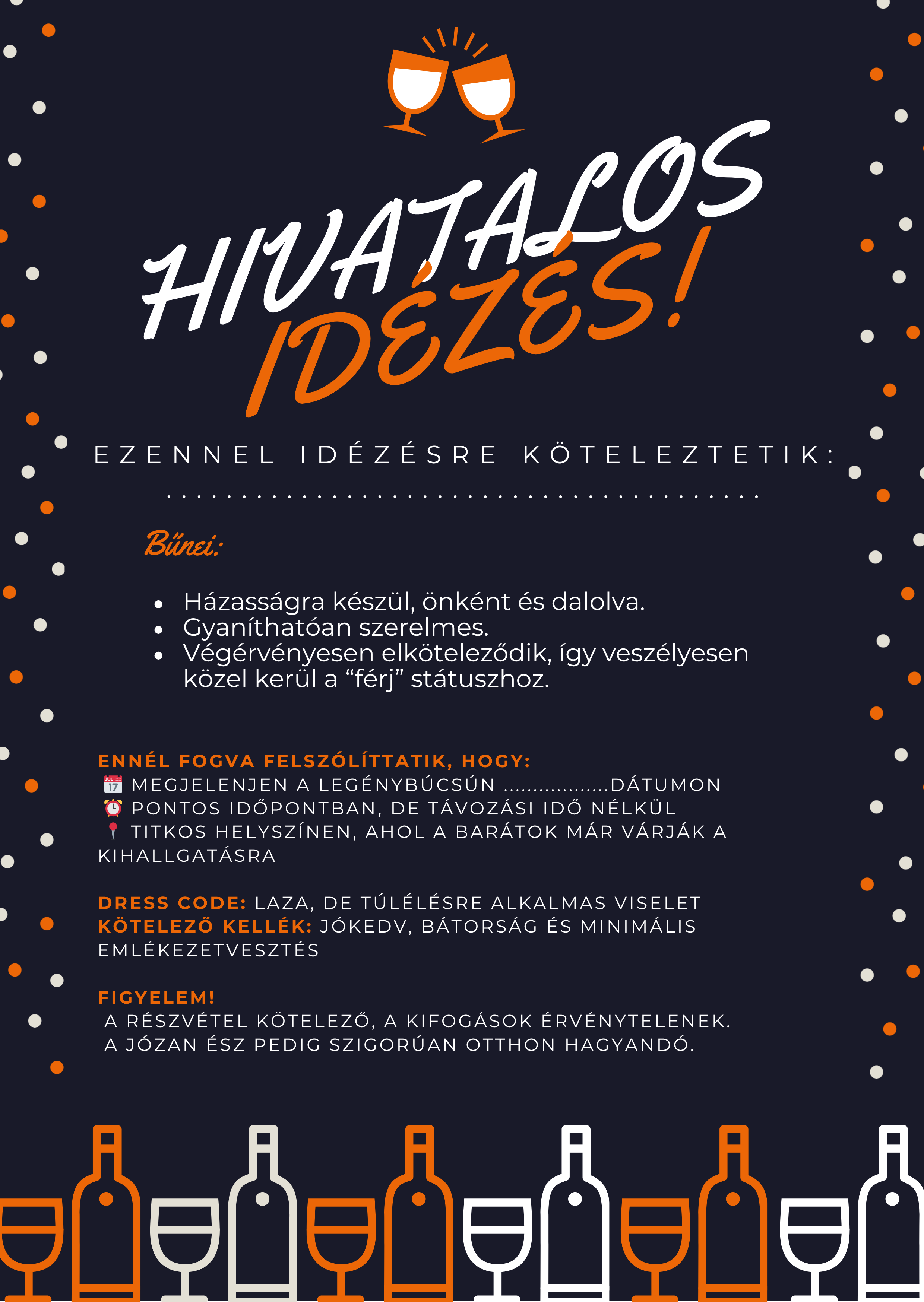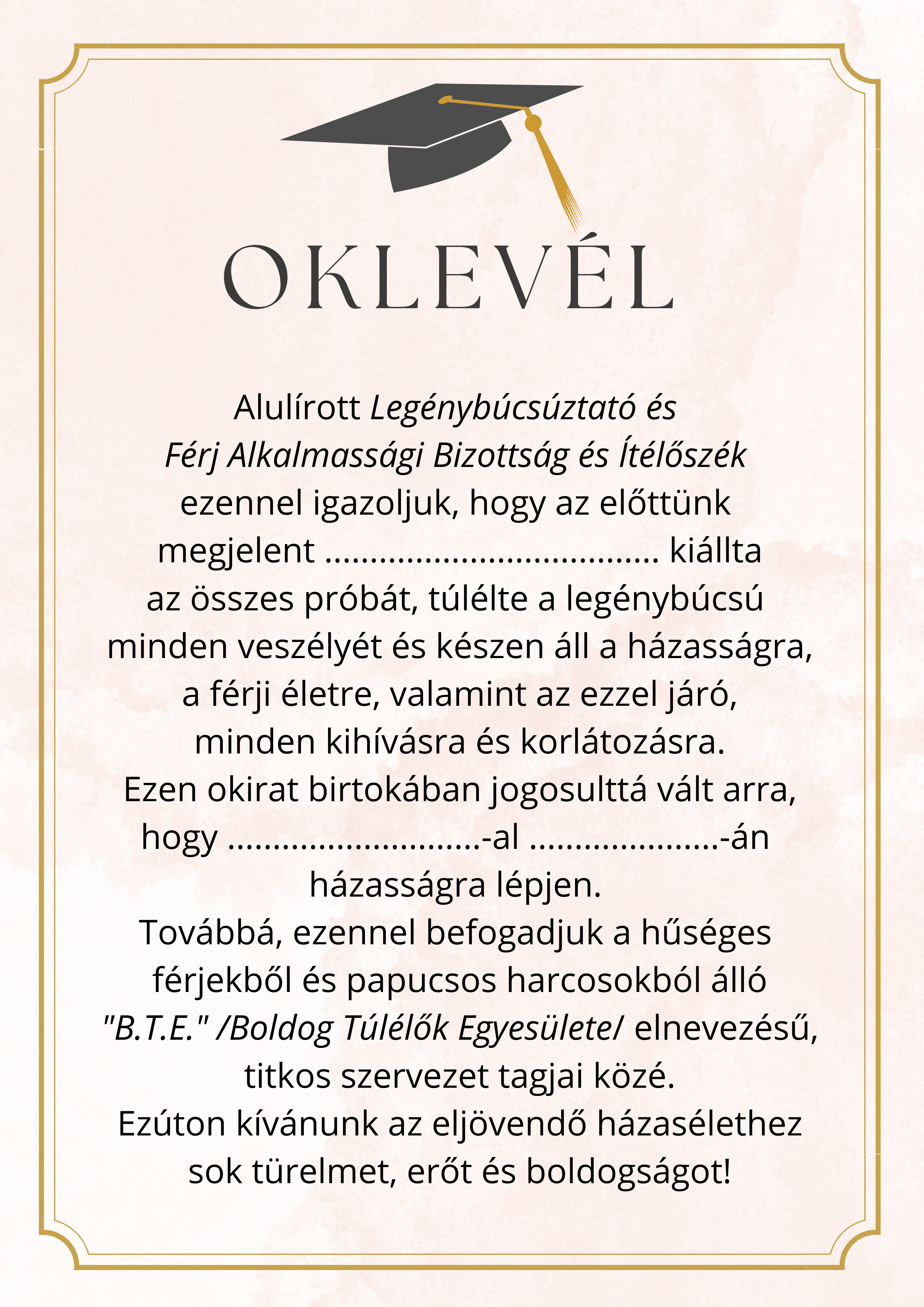 A nagy nap előtti utolsó kalandhoz tökéletes kiegészítés! Ezek az egyedi grafikájú, vicces szövegezésű lapok, mint a Fogadalom, Hivatalos idézés vagy Oklevél, garantáltan feldobják a legénybúcsú hangulatát.