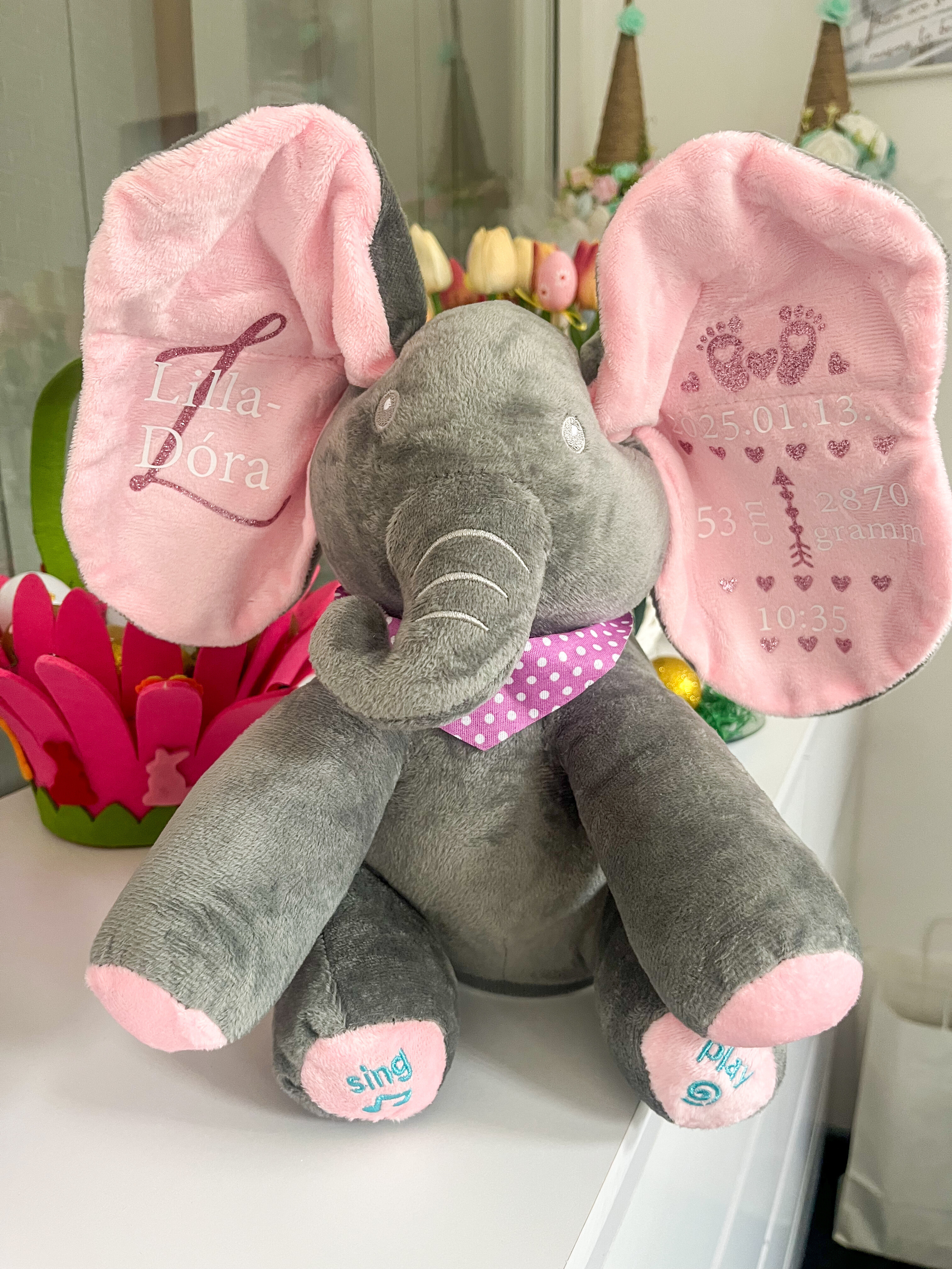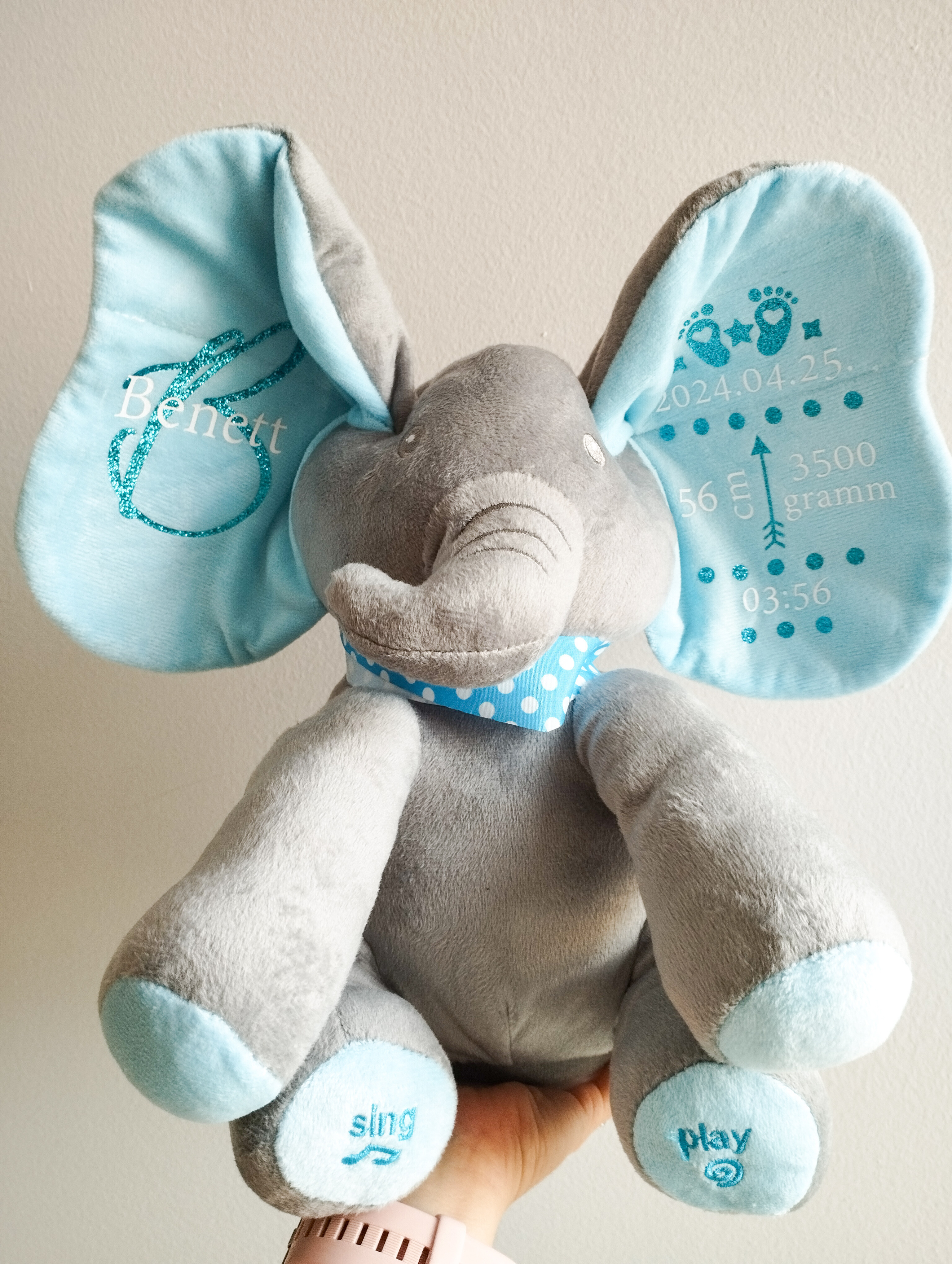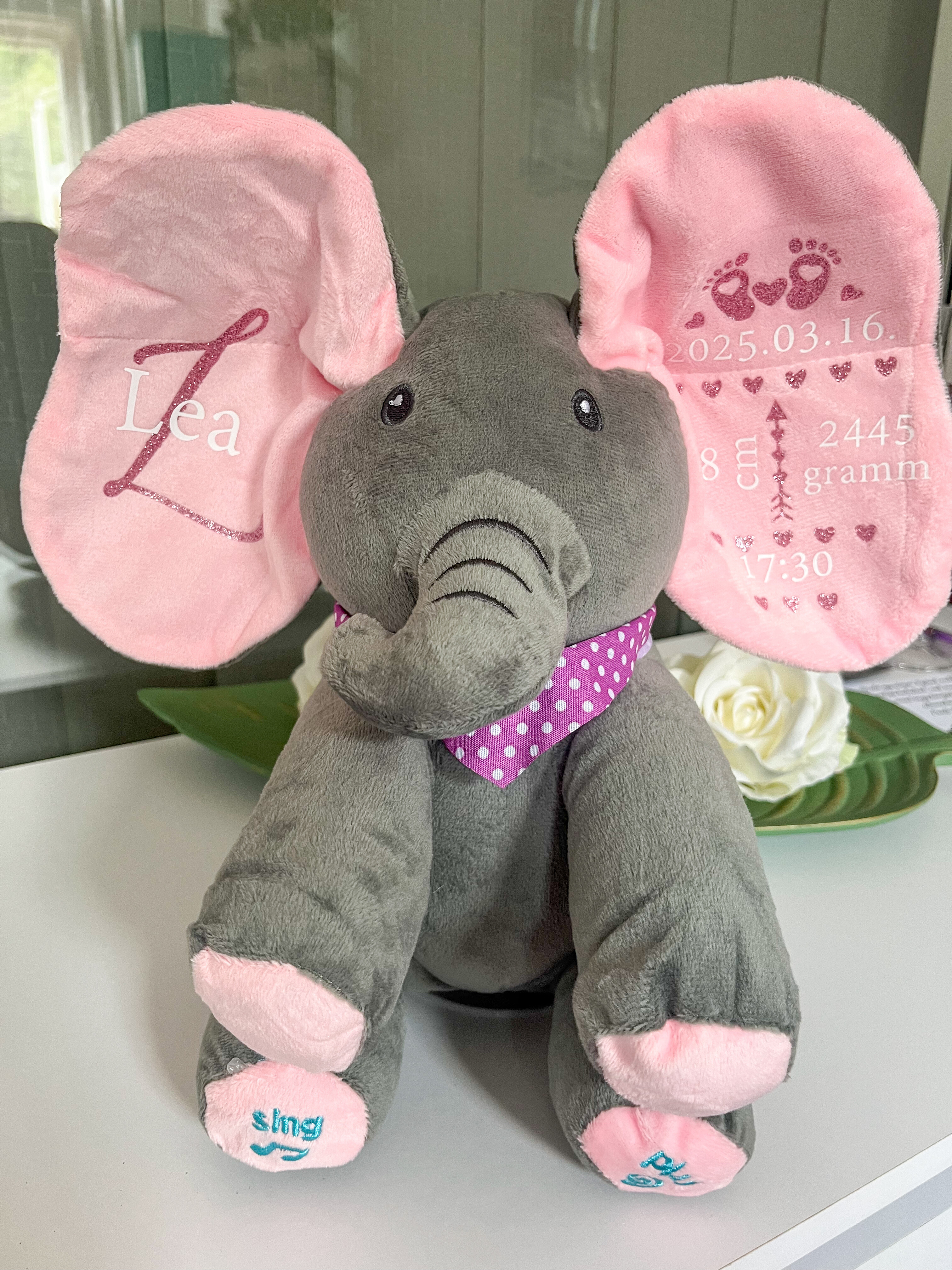 A puha plüss elefánt személyre szabható feliratokkal készül, így igazán egyedi és megható ajándék babalátogatóba, keresztelőre vagy születésnapra.