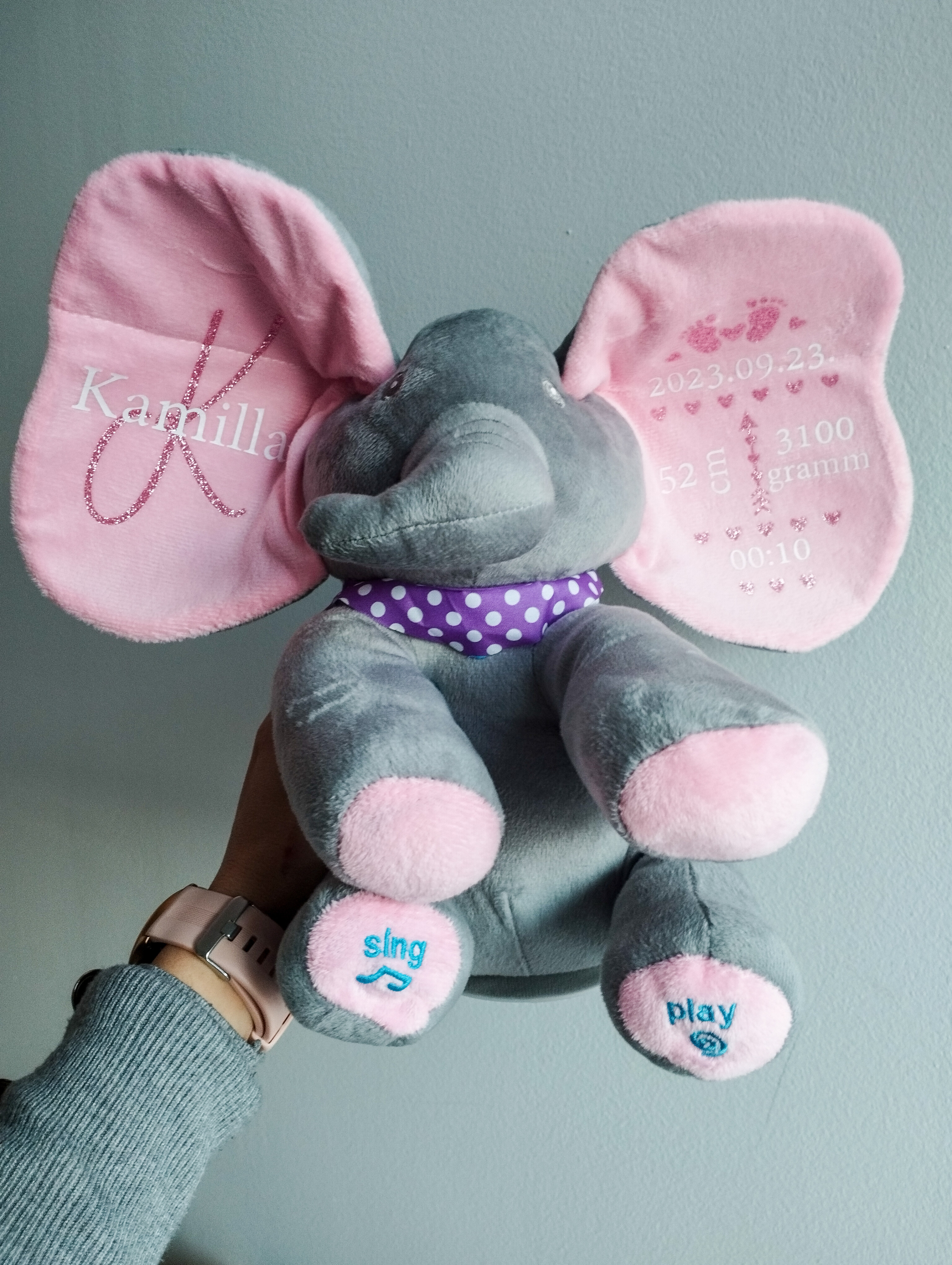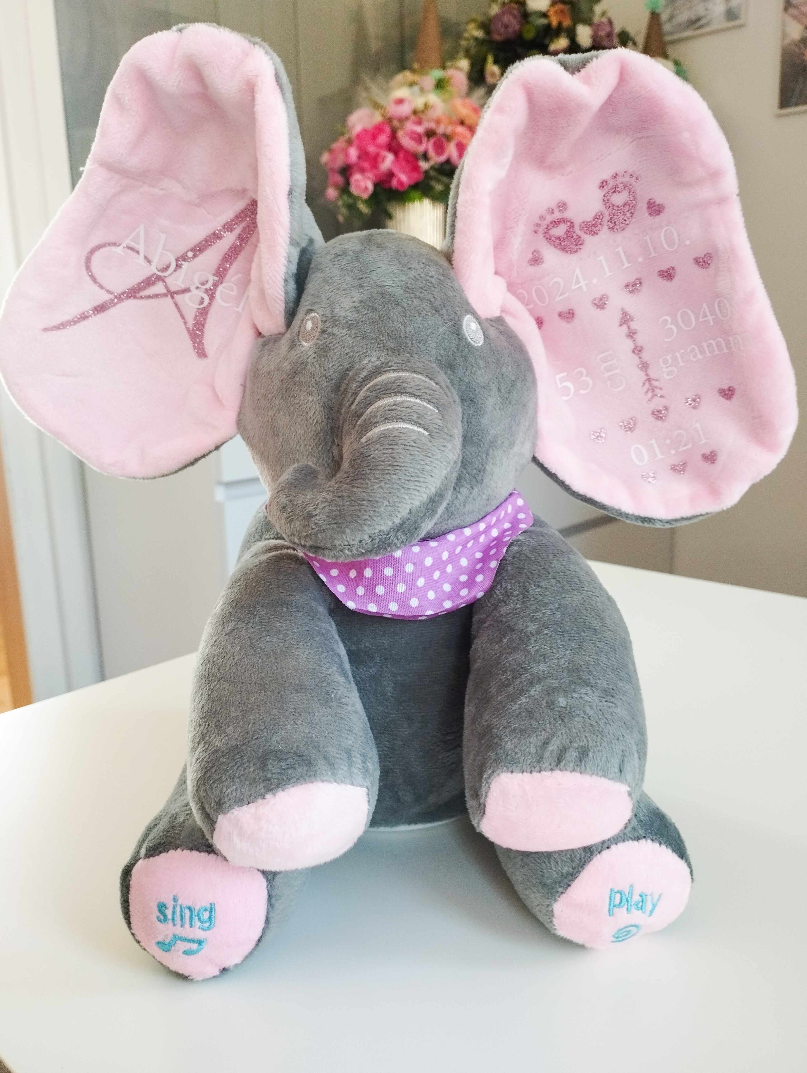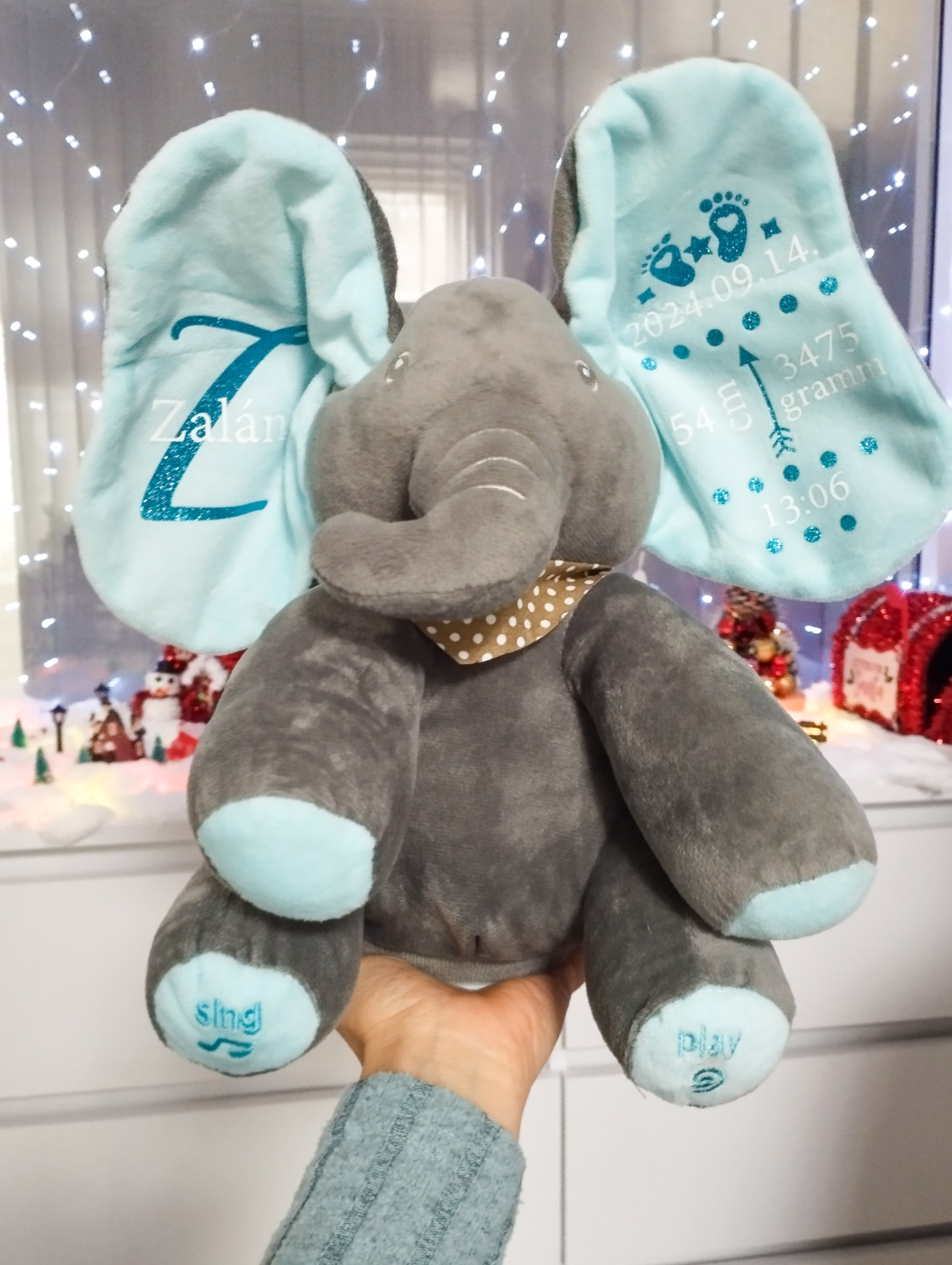 A puha plüss elefánt személyre szabható feliratokkal készül, így igazán egyedi és megható ajándék babalátogatóba, keresztelőre vagy születésnapra.