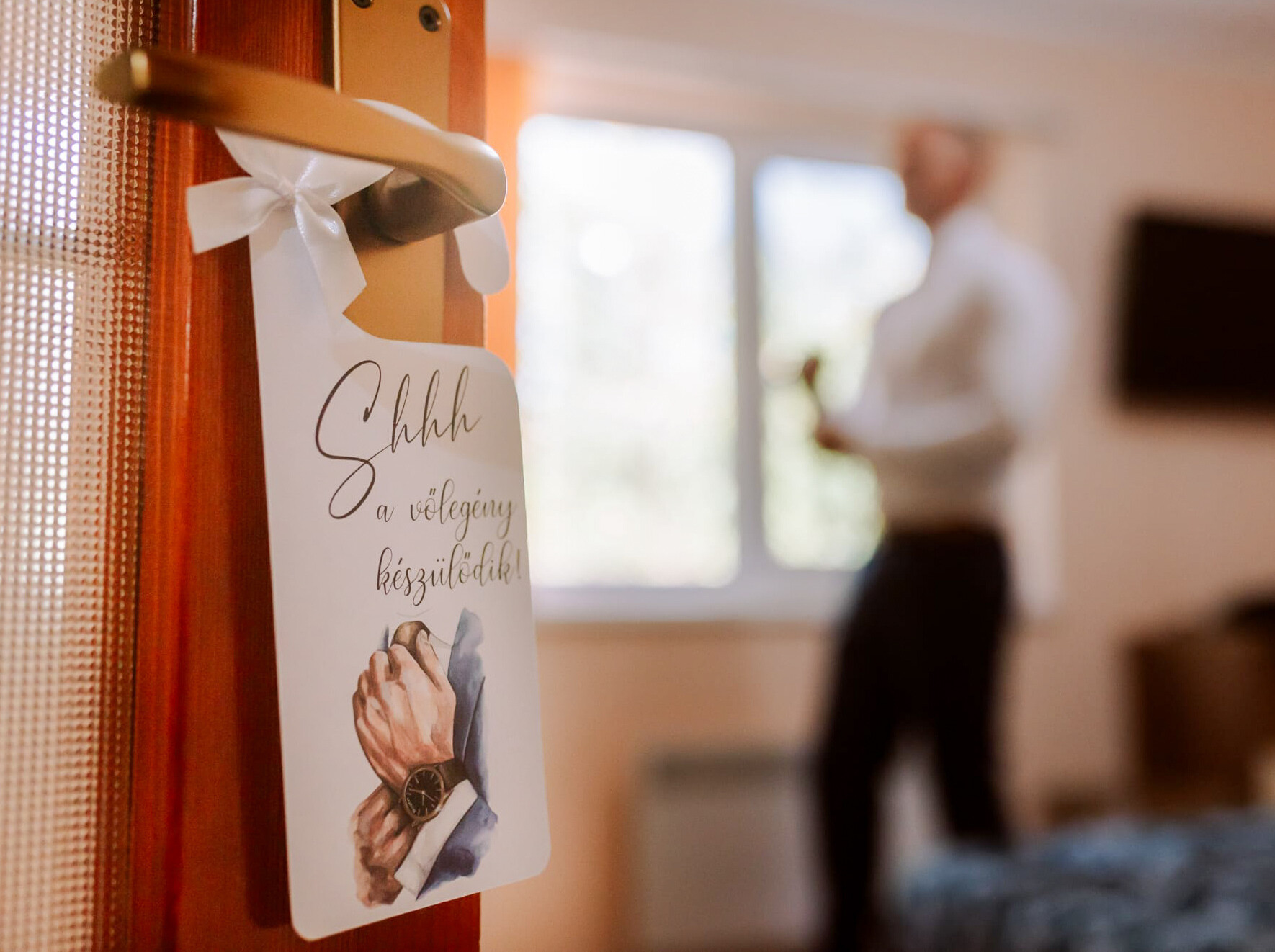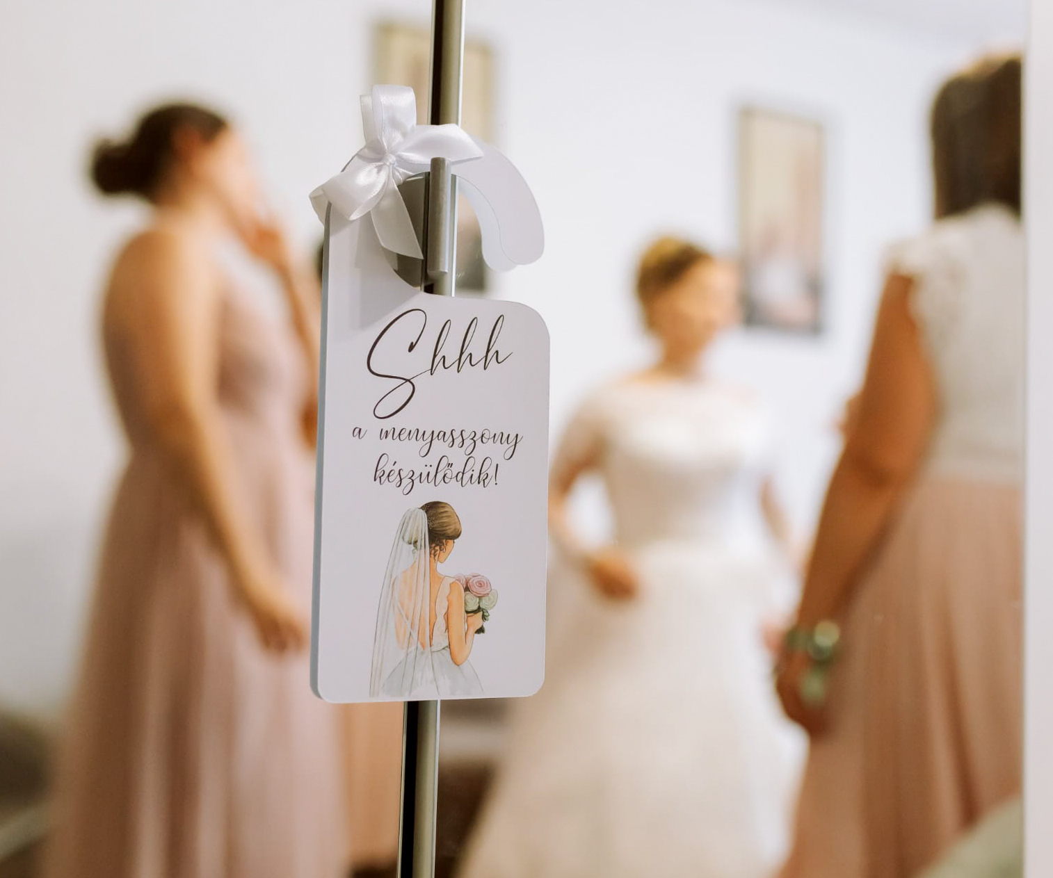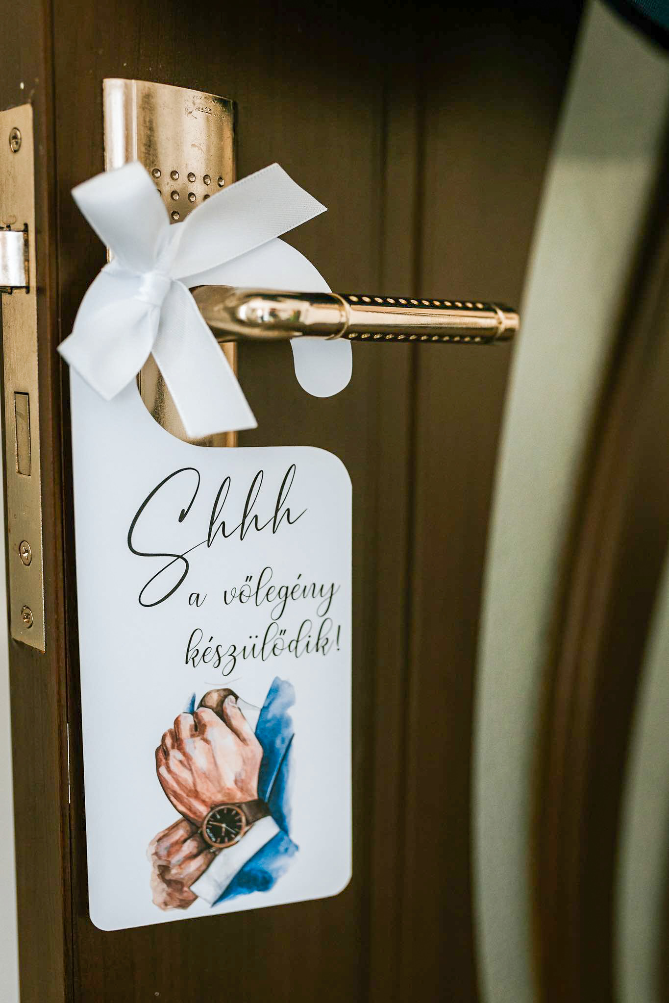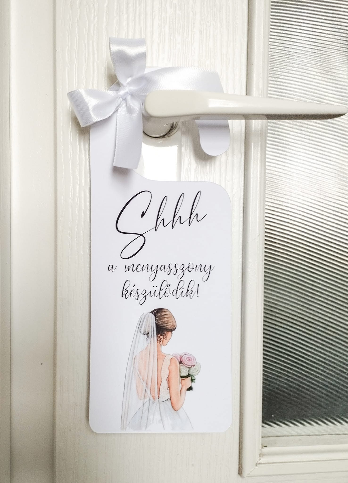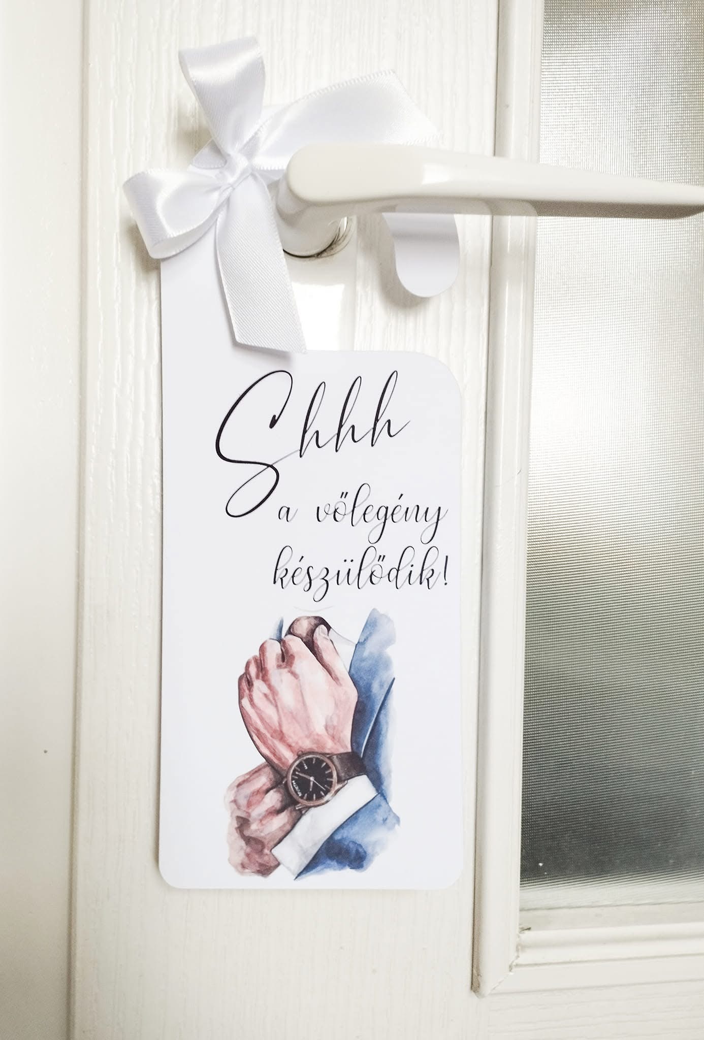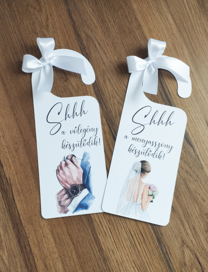 Egy apró, de annál különlegesebb részlet, ami feldobja a nagy nap előkészületeit! A „Shhh… a menyasszony / vőlegény készülődik!” ajtókilincs kártyák tökéletesek a készülődős fotókhoz, és romantikus kiegészítői a nagy nap reggelének. Egy kis játékosság, ami mosolyt csal mindenki arcára, miközben megőrzi a pillanat intimitását.