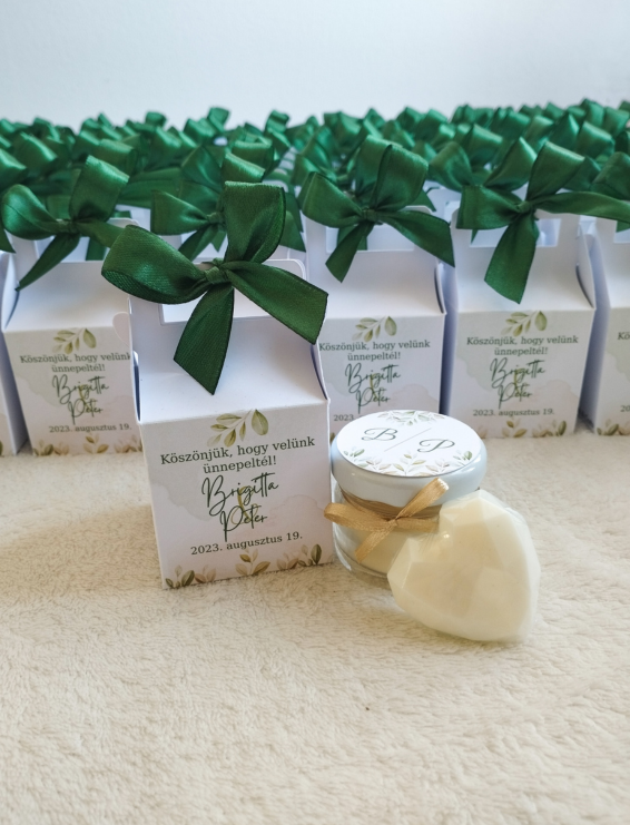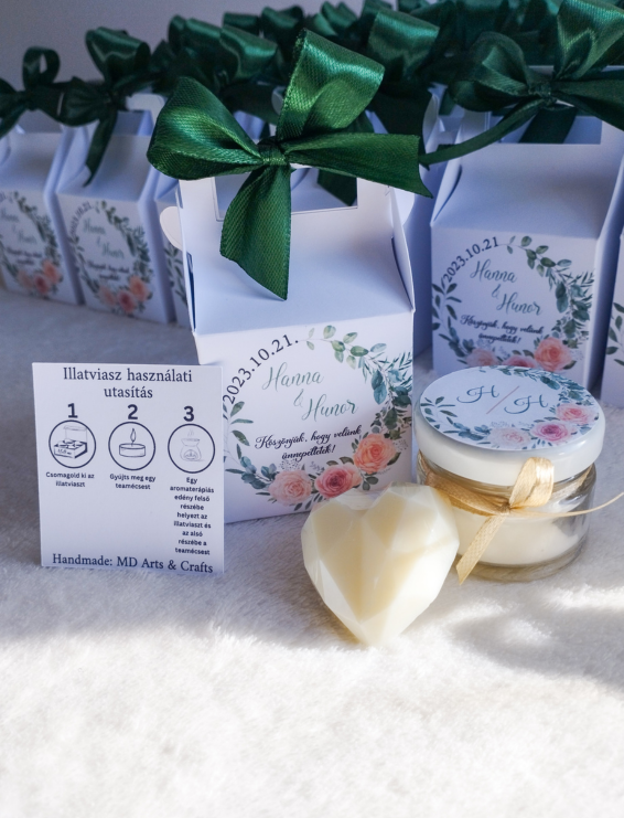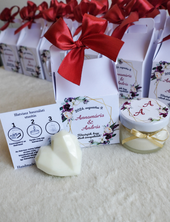Egy aprócska, mégis különleges ajándék, amely minden vendég szívét megmelengeti. A csomagban egy kézzel öntött üveges gyertya és egy szív alakú illatviasz kap helyet, egyedi grafikával ellátott dobozban, masnival díszítve.