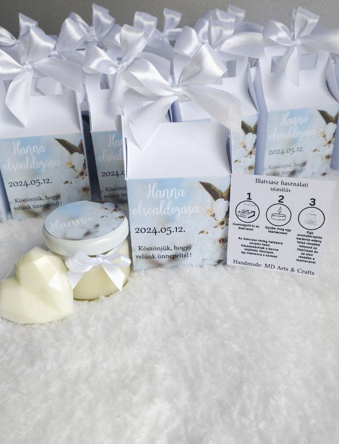 Egy aprócska, mégis különleges ajándék, amely minden vendég szívét megmelengeti. A csomagban egy kézzel öntött üveges gyertya és egy szív alakú illatviasz kap helyet, egyedi grafikával ellátott dobozban, masnival díszítve.