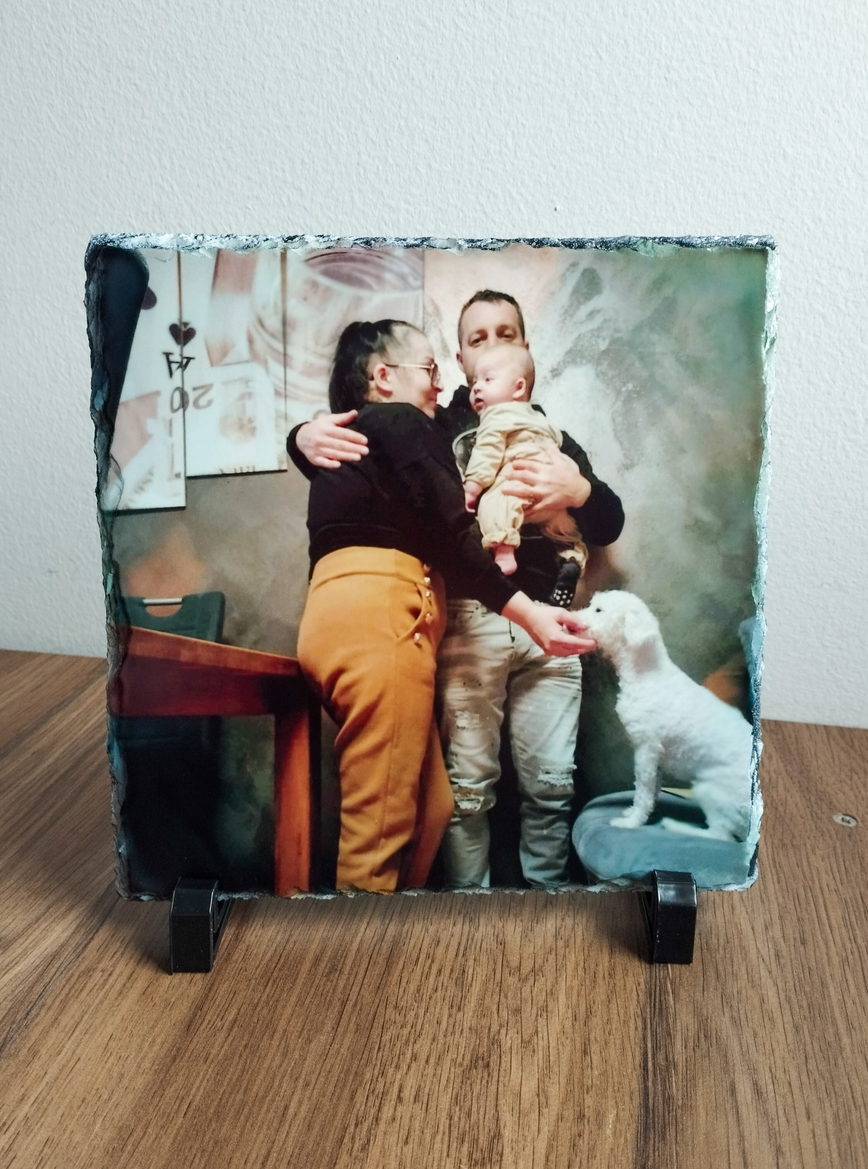 Ez a kőlapra nyomtatott fotó természetes hatású, egyedi formájú és csodásan kiemeli a rá nyomtatott fényképet.