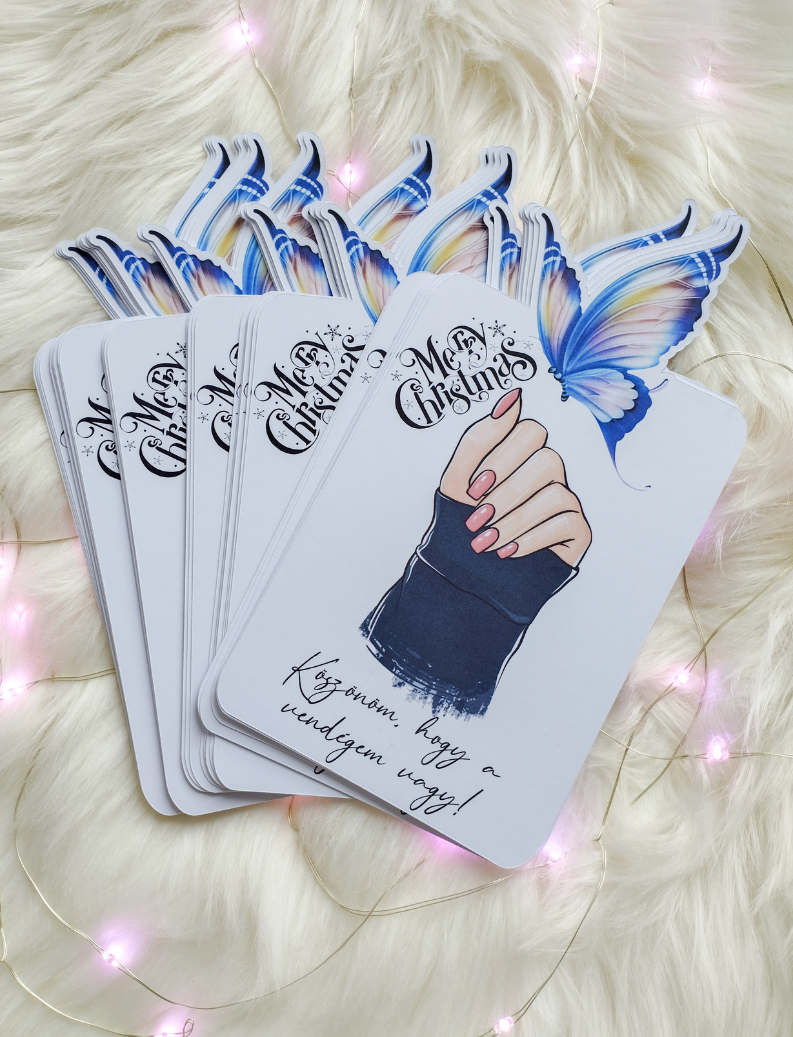 Elegáns, ünnepi hangulatú vendégkártya, amely tökéletes apró meglepetés minden manikűrös vendég számára. A kártya különlegessége a gyönyörű illusztráció, karácsonyi hangulatú részletekkel és egy látványos, színes pillangóval kiegészítve. Felirata: „Merry Christmas” és „Köszönöm, hogy a vendégem vagy!” – így egyszerre ünnepi és személyes.