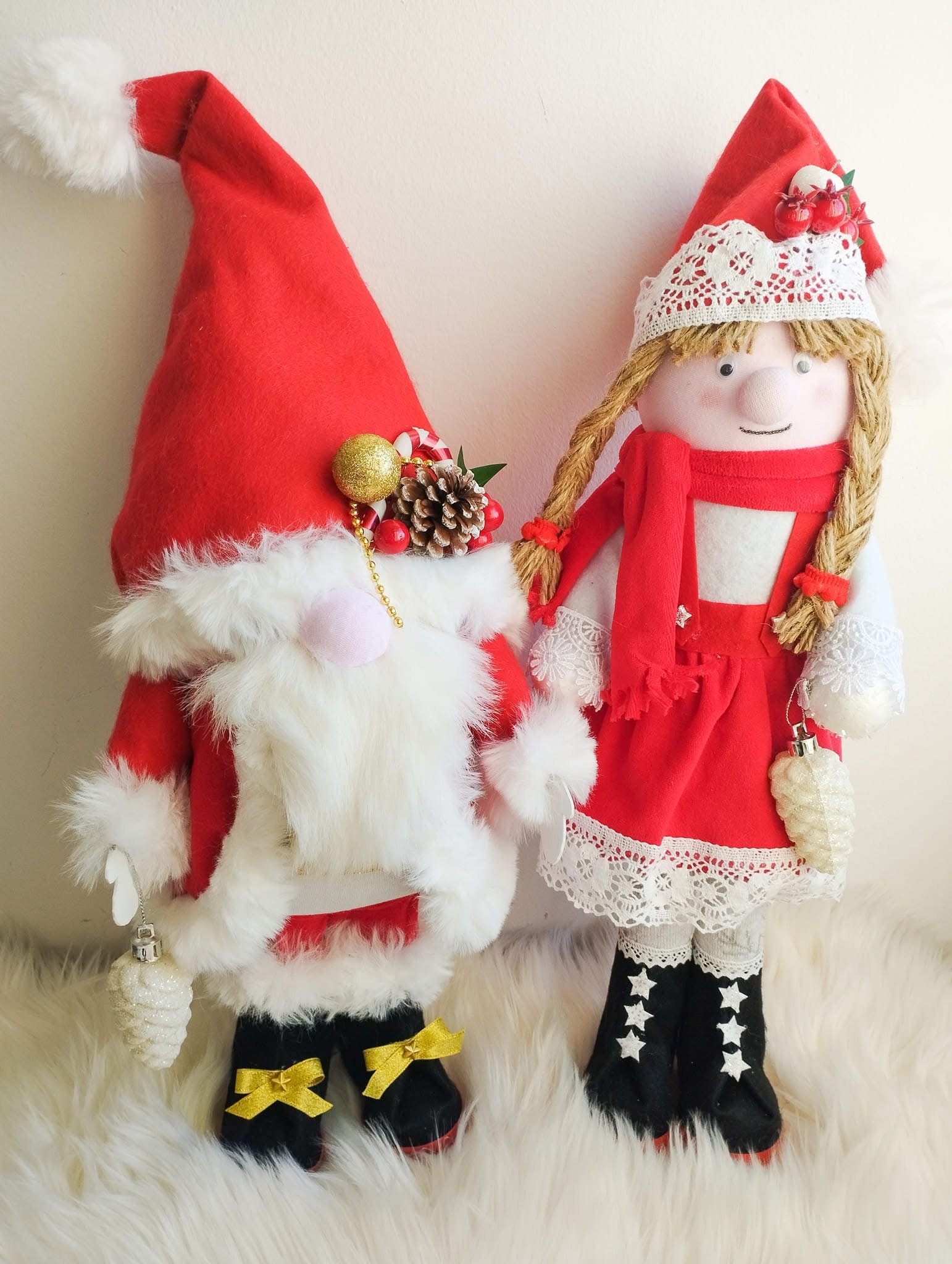 Ez a kézzel készített karácsonyi dekorációs szett egy manóból és egy manólányból áll, amelyek meleg, otthonos hangulatot teremtenek az ünnepi időszakban. A figurák részletgazdag kialakítása, textil ruházata és gondosan összeállított kiegészítői teszik őket különösen látványossá.