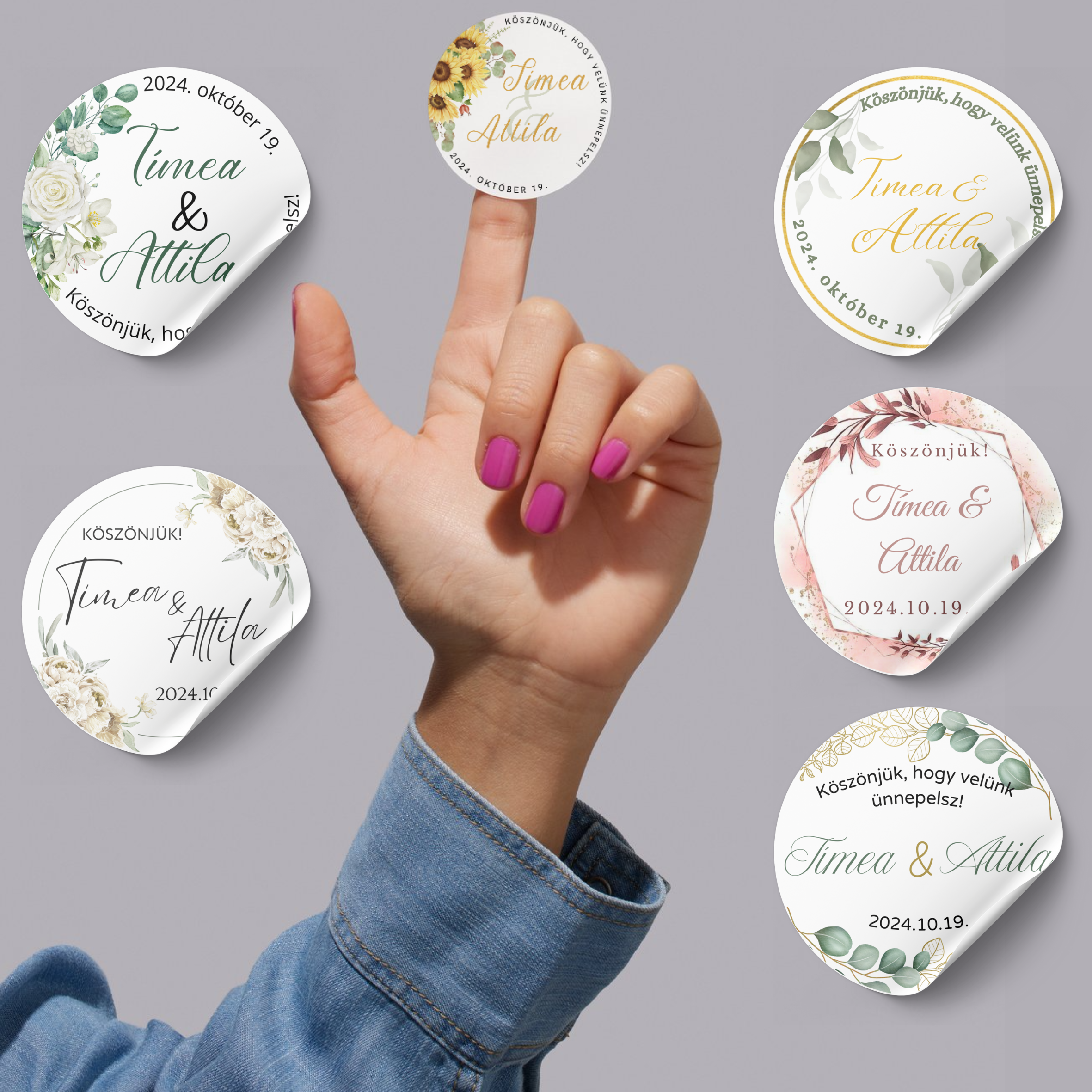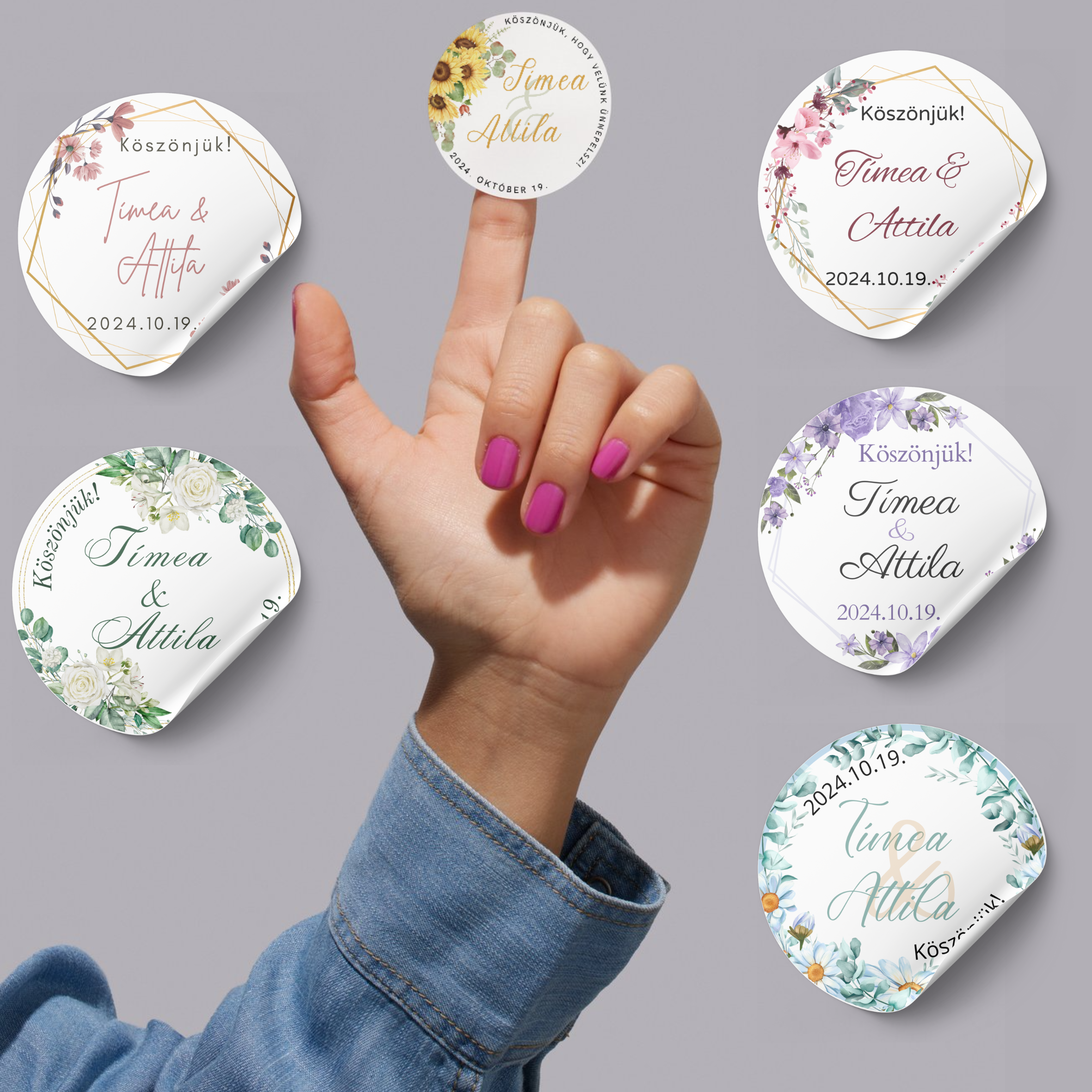 A személyre szabott matricák tökéletes kiegészítői a köszönetajándékoknak, legyen szó gyertyáról, mézről, sütiről vagy akár palackról. Ezek a kis címkék nemcsak díszítenek, hanem emlékké is válnak, hiszen minden vendég szívébe visznek egy darabot a nagy nap hangulatából.