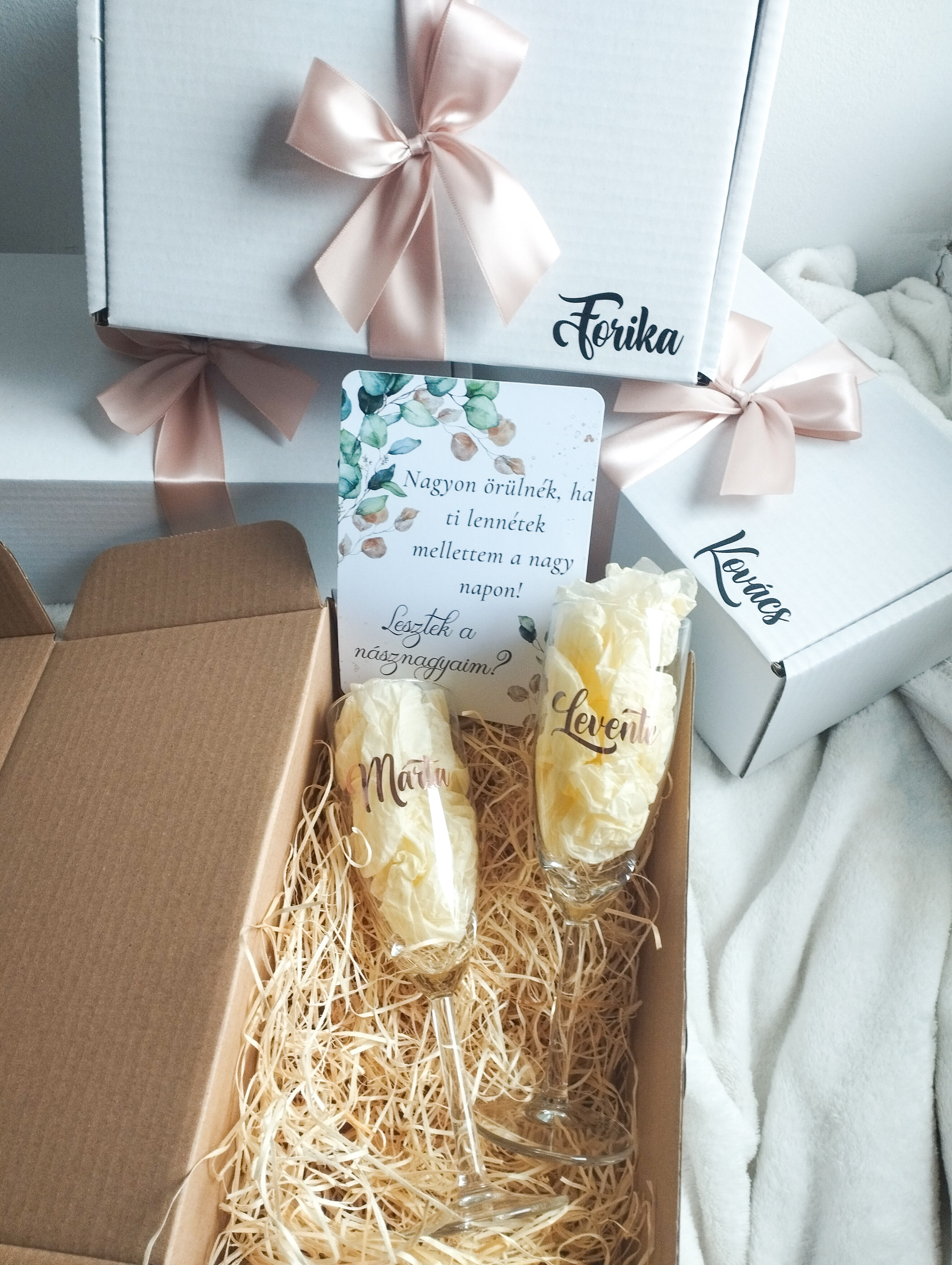 Díszdoboz, masnival és a násznagyok nevével – ajándékozásra készen