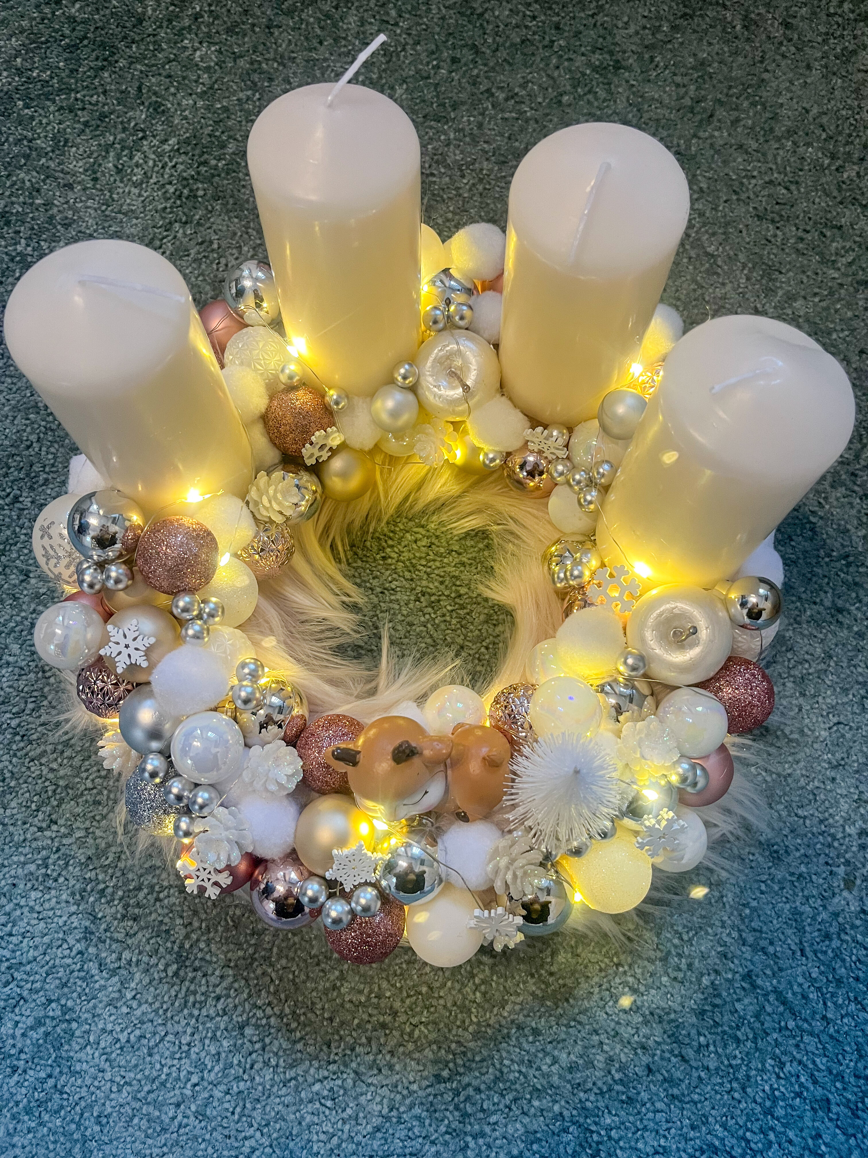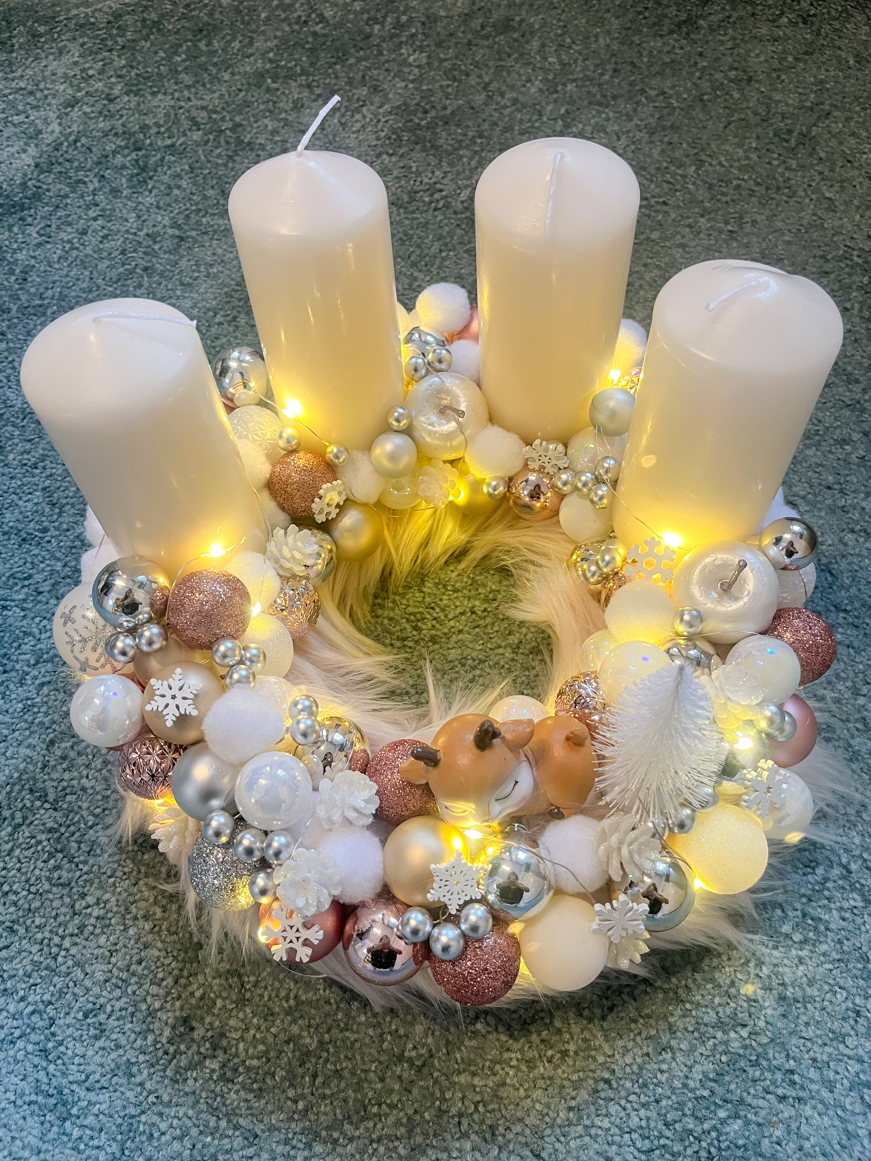 Ez a különleges adventi koszorú a meghittség, a finom elegancia és a téli varázslat tökéletes találkozása. A prémes alap puhasága és a színvilág nyugalmat áraszt, miközben a gyöngyházfényű, csillogó és matt gömbdíszek és hópelyhek játékos, mégis ünnepi hangulatot teremtenek.