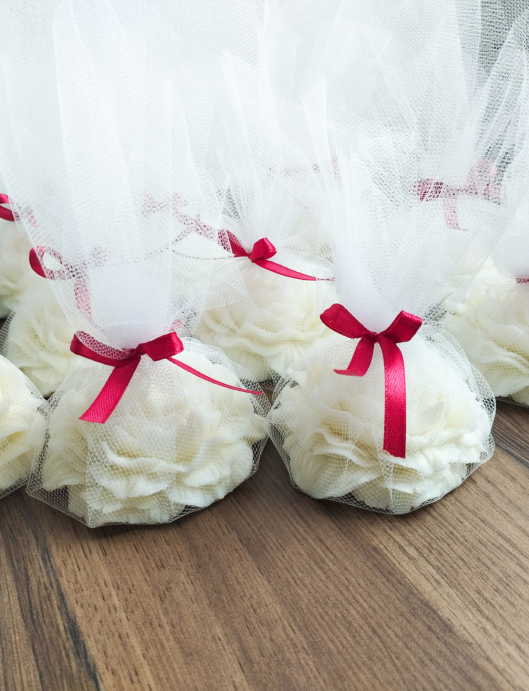 Tüllbe csomagolva, egyedi kísérőkártyával és masnival készül, névvel, dátummal és színekkel teljesen személyre szabható, hogy illeszkedjen az esküvő vagy esemény stílusához.