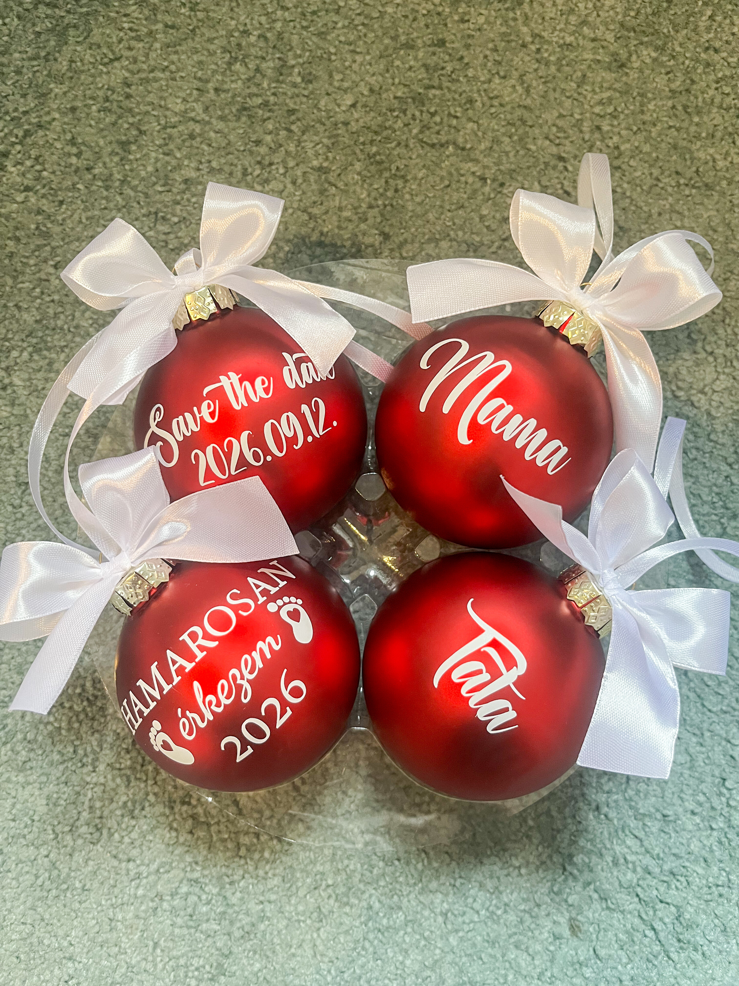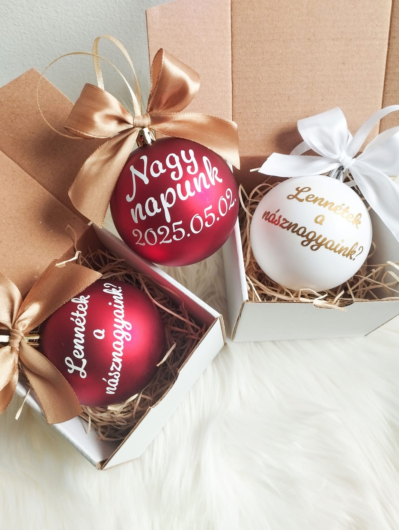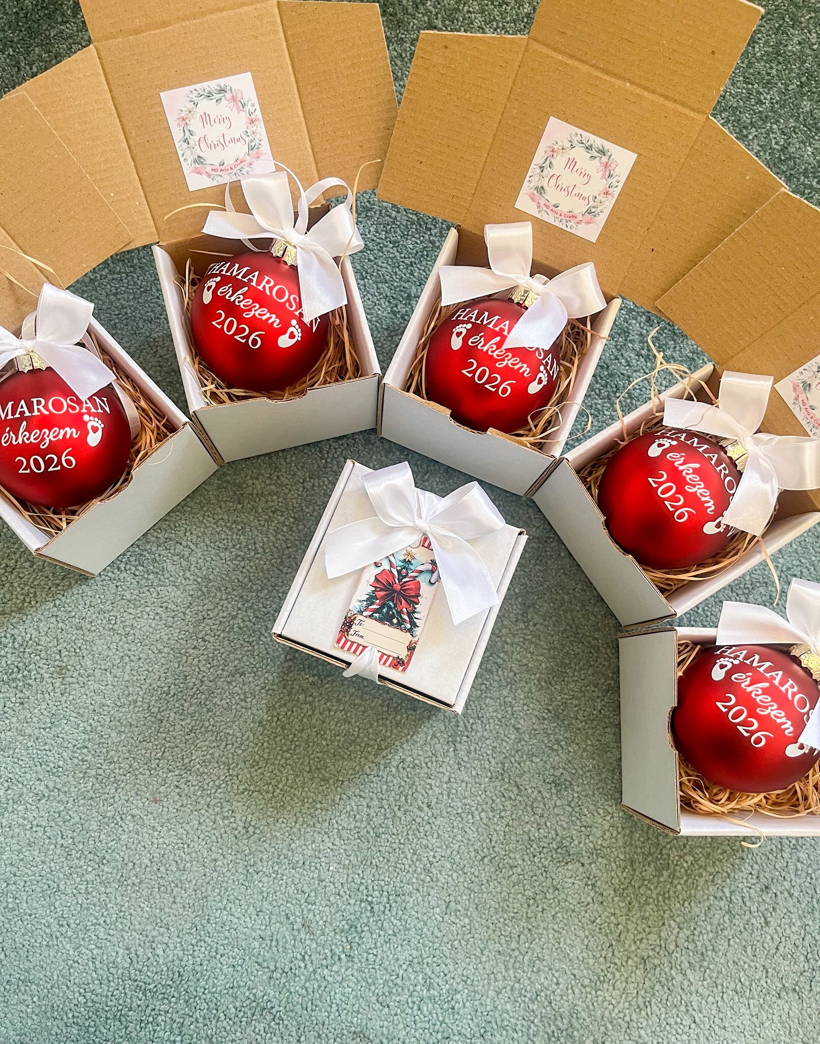 Rendelésnél, ha több típusú gömböt rendelsz vagy díszdobozokat kérsz hozzájuk, kérlek a Megjegyzésnél írd le, hogy melyik színűre melyik név kerüljön vagy melyik gömb kerüljön, melyik dobozba.