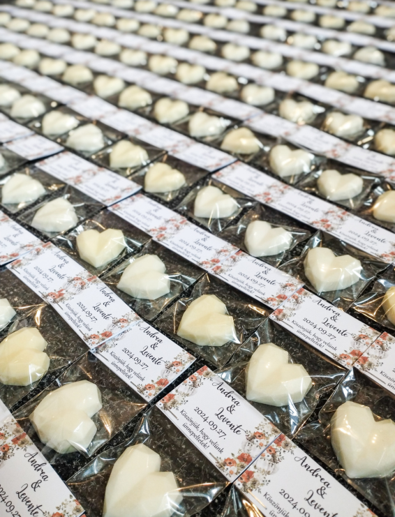 Ezek a szív alakú illatviaszok tökéletesek köszönetajándékként esküvőre. Kézzel öntött, minőségi viaszok, melyek illatukkal kellemes, otthonos hangulatot teremtenek. Egy pici figyelmesség, ami mosolyt csal a vendégek arcára.