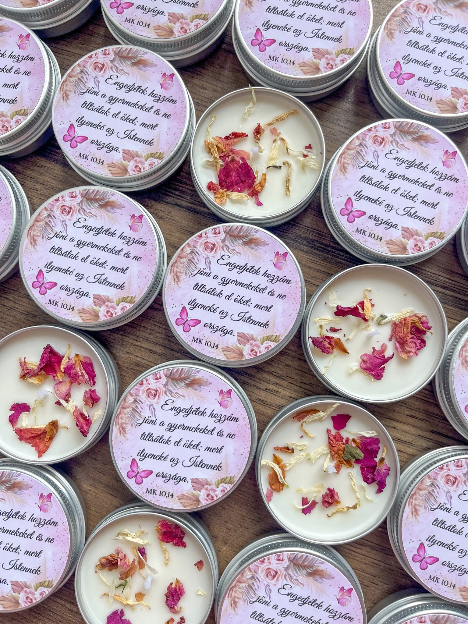 Kézzel öntött, természetes alapanyagokból készült gyertya, amely letisztult, elegáns tégelyben érkezik, illatmentes vagy illatos viasszal és apró szirmokkal díszítve. A tetőn egyedi grafika, név és dátum szerepel, így minden darab személyre szabható az esemény stílusához.