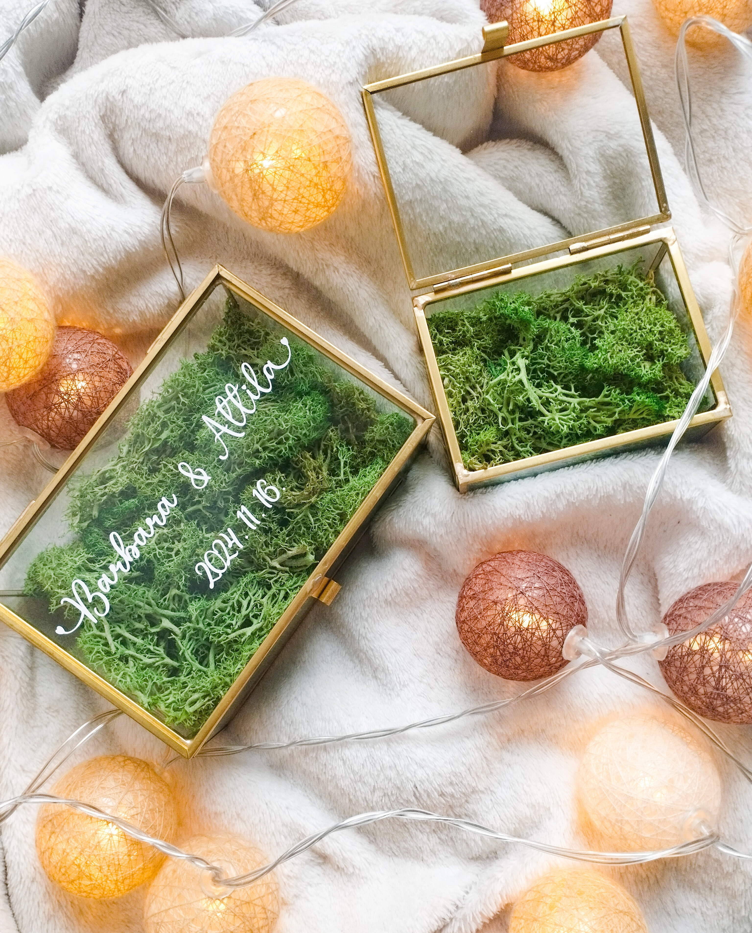 Különleges pillanat, különleges részlet. Ez a gyűrűtartó természetes eleganciájával és személyes feliratával teszi egyedivé az esküvői szertartást. Letisztult formája, üveg ablakai és a zuzmó gyönyörűen kiemeli a gyűrűket, miközben megőrzi a nagy nap legszebb emlékét.