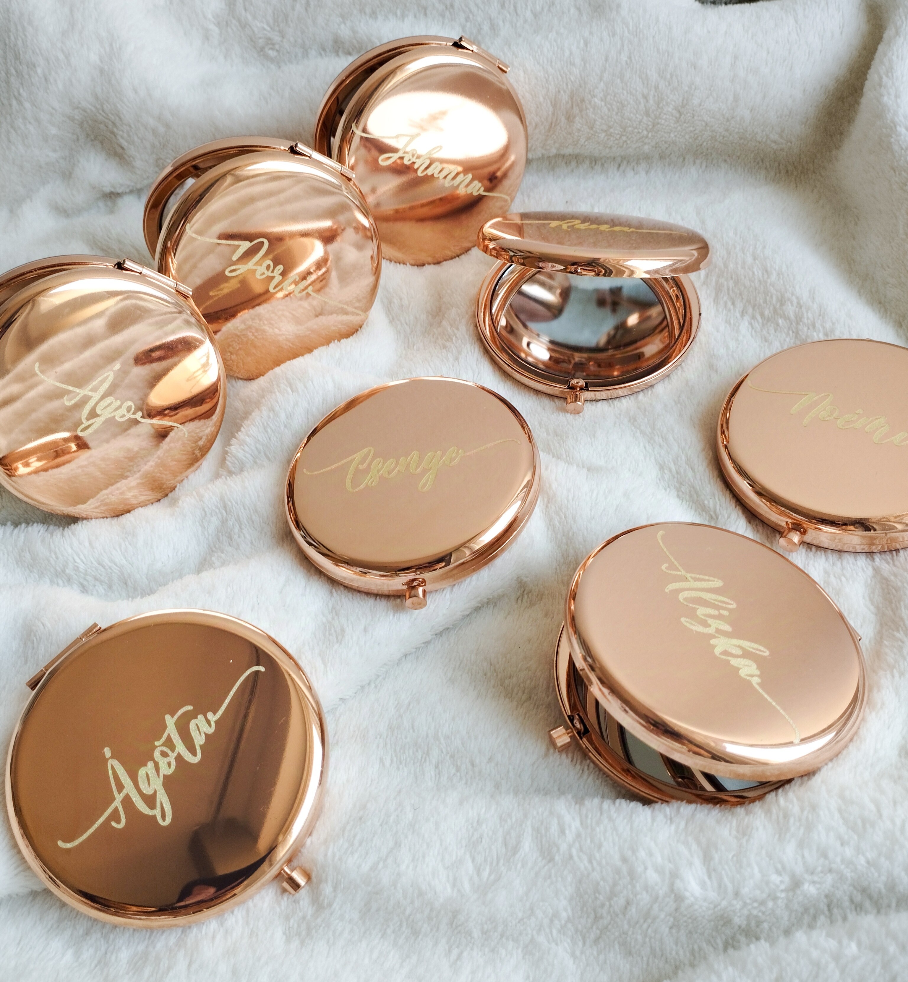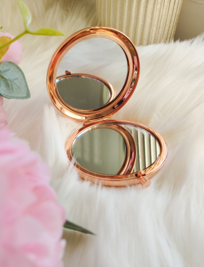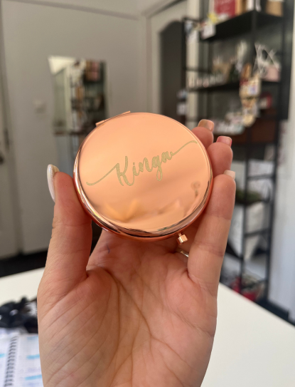 A személyre szabott rose gold zsebtükör a tökéletes kiegészítő minden alkalomra, legyen szó lánybúcsúról, esküvőről vagy egy különleges ajándékról. Kompakt méretének köszönhetően könnyen elfér bármelyik táskában, így mindig kéznél van, ha egy gyors igazításra van szükség.