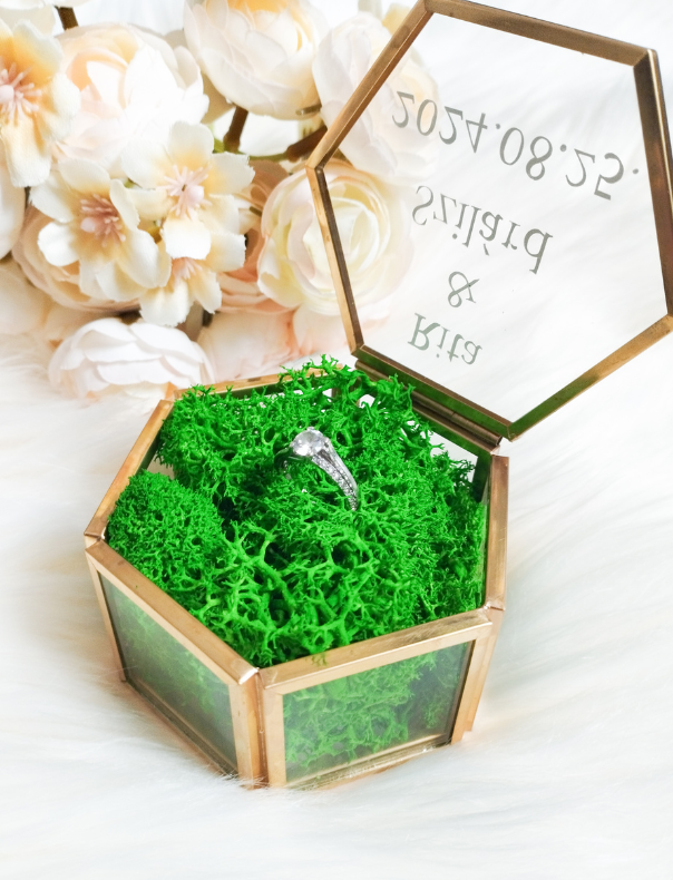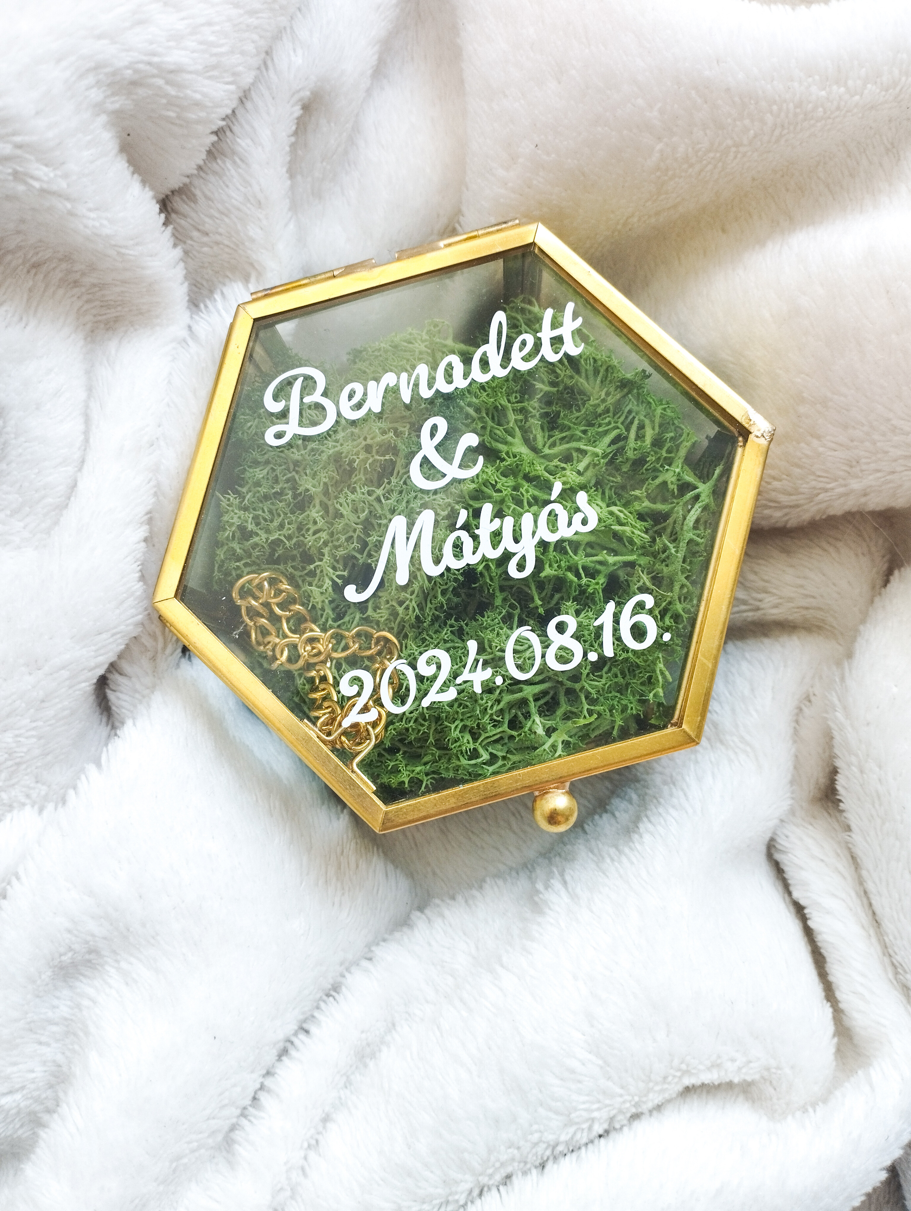 Különleges pillanat, különleges részlet. Ez a gyűrűtartó finom eleganciájával és személyes feliratával teszi egyedivé az esküvői szertartást. Letisztult formája, üveg ablakai és a zuzmó gyönyörűen kiemeli a gyűrűket, miközben megőrzi a nagy nap legszebb emlékét.