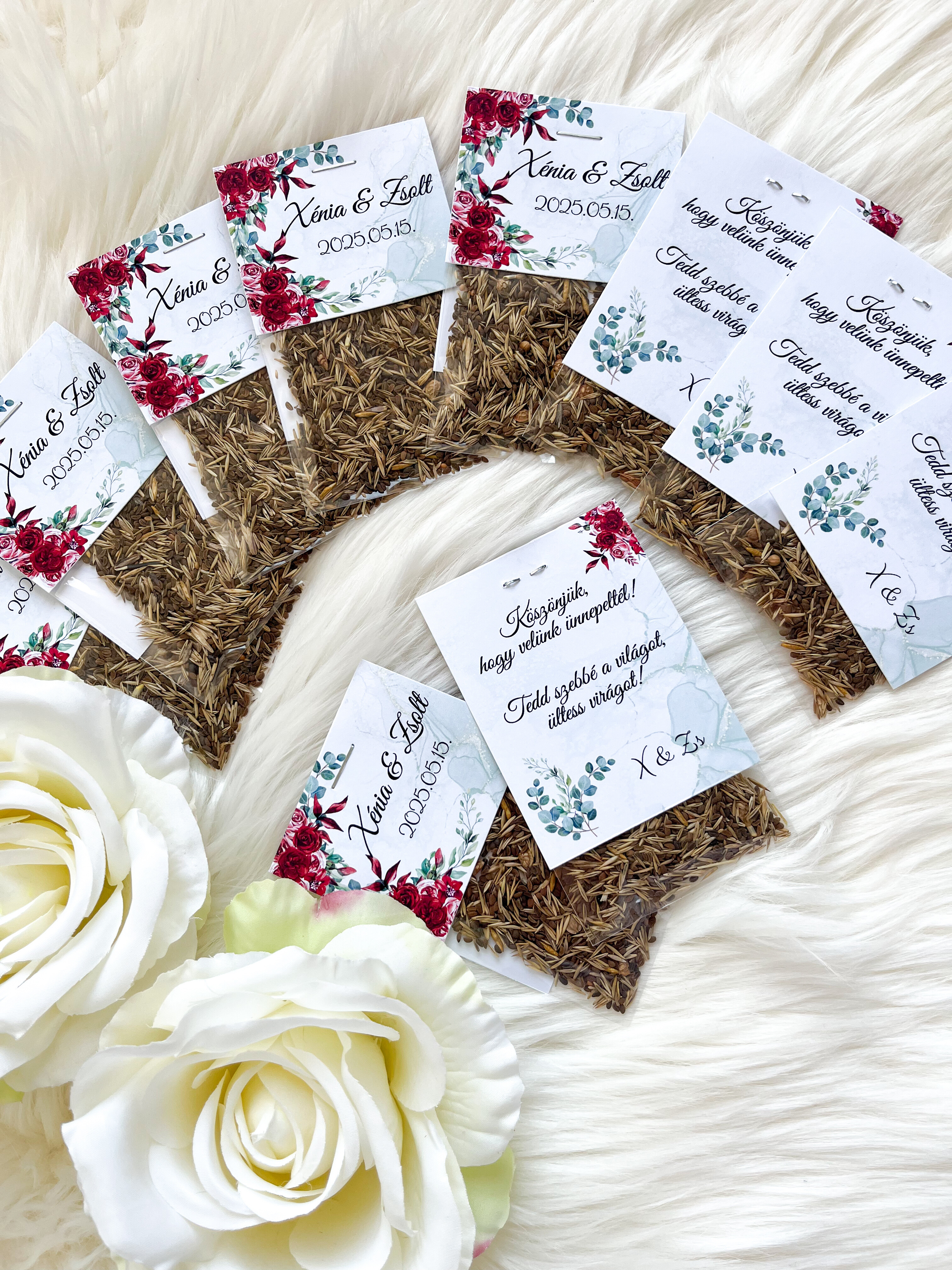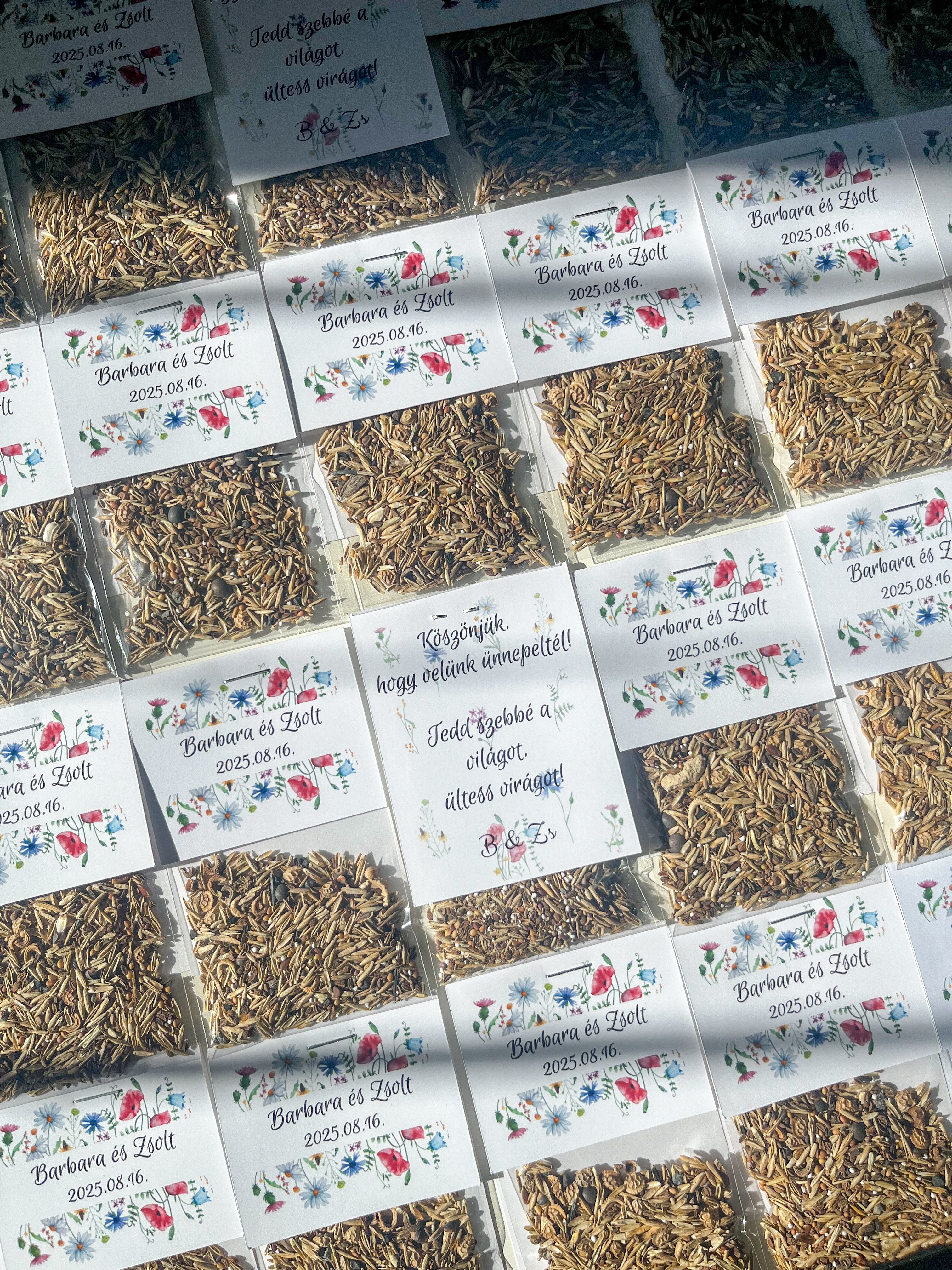 A virágmagos csomag nemcsak kedves gesztus a vendégek felé, hanem maradandó emlék is: ahogy a mag kikel és virágba borul, úgy idézi fel a nagy nap szépségét újra és újra.