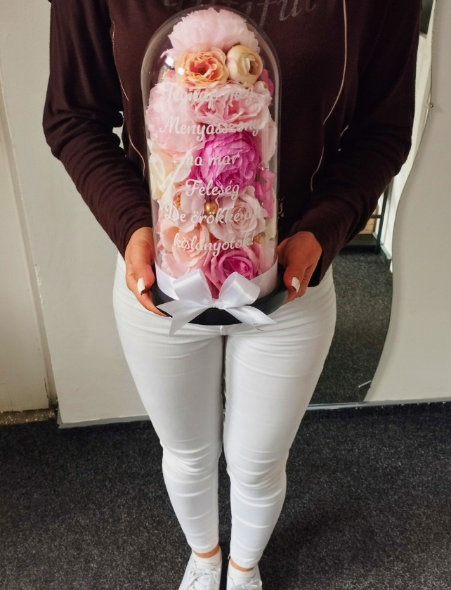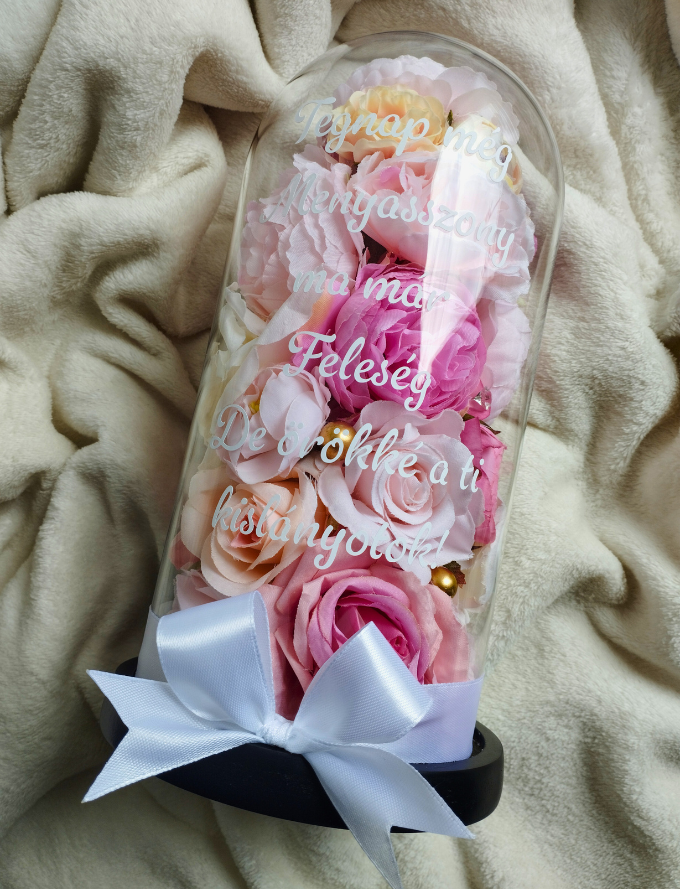 A kompozíció műrózsákból készül, így sosem hervad el, az üvegbúrára pedig egyedi felirat kérhető. Minden darab gondosan, kézzel készül, hogy igazán méltó legyen az alkalomhoz.
