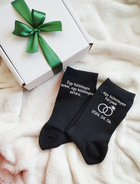 Ez a személyre szabott, feliratos esküvői zokni tökéletes ajándék a leendő férjnek. Apró gesztus, ami mosolyt csal az arcára, miközben a nagy nap minden pillanatát áthatja a szeretet és a gondoskodás.
